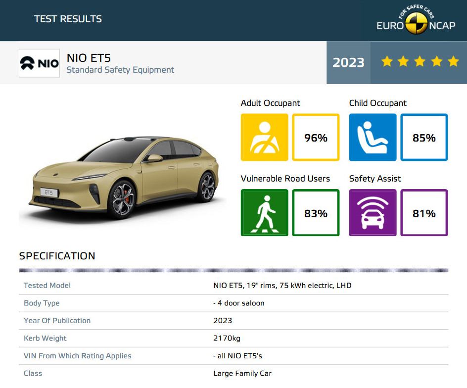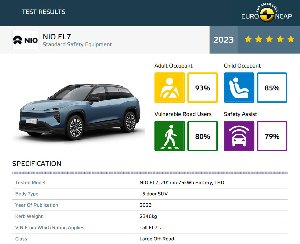 Der neue Euro NCAP umfasst unter anderem erweiterte Tests für die Erkennung von Kindern im Fahrzeug, Motorradszenarien, ungeschützte Verkehrsteilnehmer, passive Sicherheit, Fahrzeugüberflutung und erweiterte eCall (SOS-Taste)-Tests. NIO ET5 und EL7 waren die ersten Autos, die die brandneuen Euro NCAP Active Safety-Szenarien durchlaufen haben, die 2023 eingeführt wurden: Auto-Motorrad, Auto-Kreuzung, Auto-Frontalzusammenstoß, Türöffnung und Fahrerüberwachung.