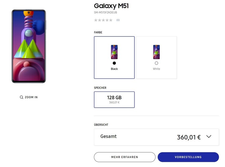 Das Galaxy M51 ist ab sofort in Deutschland um 360,01 Euro vorbestellbar, es stehen zwei Farboptionen (Schwarz und Weiß) zur Auswahl. Wer das Galaxy M51 in den Warenkorb legt, erfährt dort, dass es höchstwahrscheinlich ab dem 11. September ausgeliefert wird. Der Preis ist nicht als extrem günstig aber als durchaus konkurrenzfähig zu bezeichnen - vergleichbare Smartphones mitt etwas kleinerem Akku, etwa das Mi Note 10 Lite mit 128 GB Speicher sind etwa bei Amazon um die 320 Euro zu finden. In der gleichen Liga spielt natürlich auch der sehr ähnliche Bruder Galaxy A71, allerdings ohne Riesenakku.