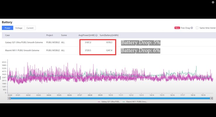 Beide Kontrahenten konnten eine stabile durchschnittliche Framerate von 59,6 FPS halten, der Exynos 2100 ist hier also auf einer Höhe mit dem Qualcomm-Chip. Die Überraschung zeigt sich beim Thema Stromverbrauch und Akkuverbrauch. Irgendwas macht Samsung hier besser als der Snapdragon 888 im Mi 11, denn der Stromverbrauch ist im Galaxy S21 Ultra um etwa 15 Prozent niedriger, ein doch unerwarteter Sieg für den Exynos 2100 - zumindest bei diesem Spiel und die anderen möglichen Hardware-Unterschiede außer acht lassend. Wie ein zweites Video des Golden Reviewer zeigt (siehe weiter unten), sieht die Situation beim Game Genshin Impact aber leider doch wieder ganz anders aus.