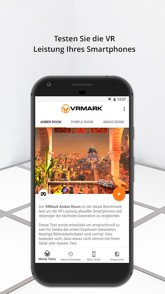 - Amber Room: Dieser VR-Room repräsentiert Next-Gen VR-Content und fordert auch aktuelle High-End-Smartphones mit hoher Leistung sehr stark. UL Benchmark empfiehlt diesen Benchmark-Teil für Geräte, die in den beiden anderen Tests schon sehr gut performen.