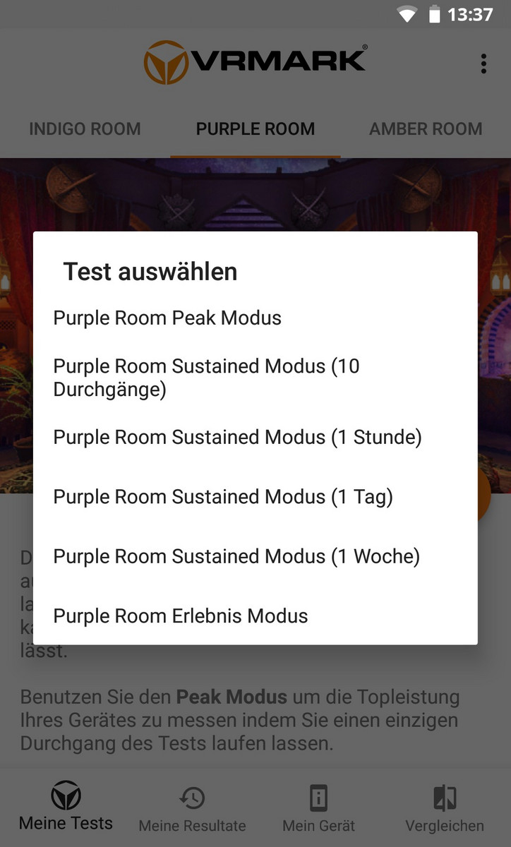- Purple Room: Dieser virtuelle Raum ist darauf ausgelegt, dass First-Gen Daydream-Geräte zumindest einen Run erfolgreich absolvieren können. Einige Smartphones könnten sich allerdings im Loop (Testschleife) sehr stark erwärmen und die Performance wegen Zurückregeln der Leistung sinken.