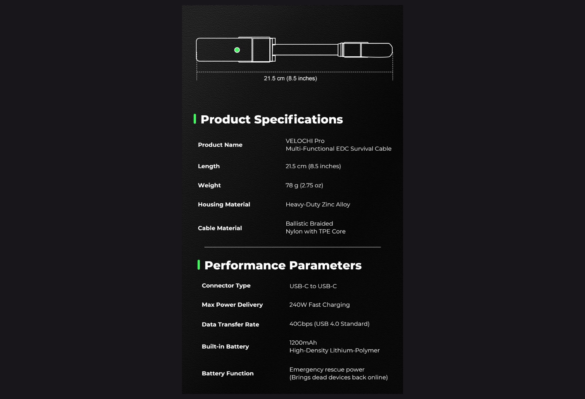 Velochi Pro wird als Everyday Carry (EDC) Gadget für Technik-Enthusiasten vermarktet. Während viele EDC-Tools Werkzeuge wie Messer, Schraubendreher oder Paketöffner kombinieren, ist das Herzstück von Velochi Pro ein USB-C auf USB-C Kabel, das Datenraten bis 40 Gbit/s erreicht, und das Geräte mit bis zu 240 Watt aufladen kann. Damit konkurriert Velochi Pro mit hochwertigen USB-4-Kabeln (ca. 14 Euro auf Amazon).