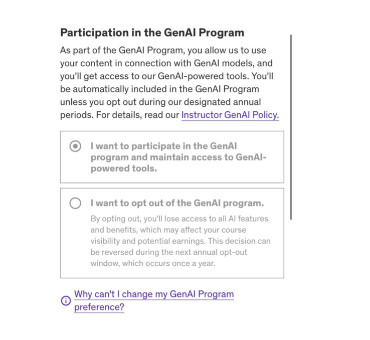 So geht es derzeit einigen Dozenten auf Udemy, wie die Webseite 404media berichtet. Am 21. August hat der Konzern verkündet, dass es eine generative KI mit den Daten der abgehaltenen Klassen trainieren würde. Die Lehrenden wurden vor die Wahl gestellt, ob sie mitmachen möchten oder nicht. Das Problem: Die Funktion war standardmäßig nicht nur aktiviert, sondern die Möglichkeit zum Opt-Out ist wenig später, nämlich schon am 12. September, nicht mehr verfügbar. Die Lehrenden hatten also nach der Udemy-Ankündigung am 21.8. nur bis zum 12.9. Zeit die Teilnahme abzubrechen, wovon Udemy zudem unter Androhung möglicher monetärer Einbußen abrät.