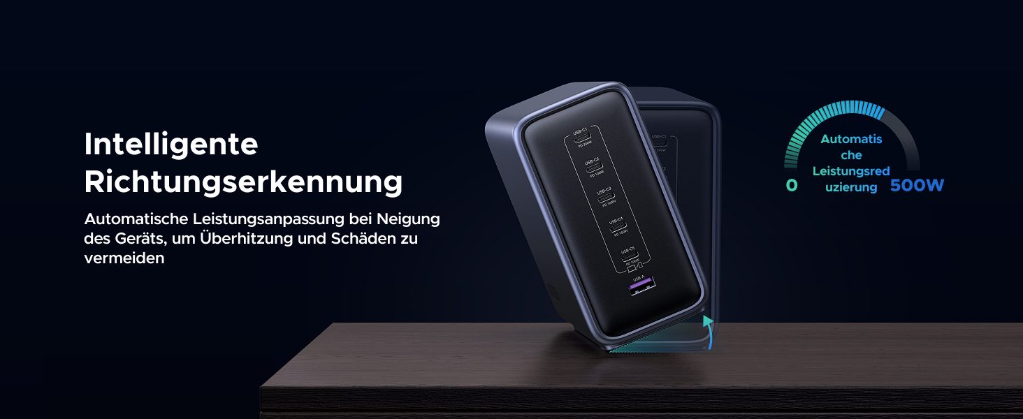 Es stehen insgesamt sechs Ports bereit. Fünf Anschlüsse sind im modernen und verdrehsicheren USB Typ C vorhanden, dazu kommt noch einmal USB Typ A. Dabei unterstützt nur der obere USB Typ C-Ausgang eine Ausgangsleistung von 240 Watt, die anderen USB Typ C-Ports sind auf 100 Watt und der USB Typ A-Anschluss auf 20 Watt begrenzt. Werden alle sechs Ports belastet, ergibt sich einmal eine maximale Ausgangsleistung von 240 Watt, viermal 60 Watt und einmal 20 Watt über USB Typ A. Mit einem Gewicht von 1,8 Kilogramm und Abmessungen von 14,6 x 6,0 x 11,5 Zentimetern handelt es sich wenig überraschend um ein nicht sehr kompaktes und auch recht schweres System, welches sich primär für den semi-stationären Einsatz eignen dürfte. Kippt das Ladegerät um, soll sich die Ladeleistung intelligent und automatisch reduzieren.