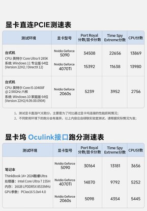 Die Grafikkarte wird wahlweise über USB-C mit Datenraten von bis zu 40 Gbit/s, oder über OCuLink mit bis zu 64 Gbit/s an einen PC, Laptop oder Gaming-Handheld angeschlossen. Wie die Benchmark-Resultate von Ugreen zeigen, sinkt die Performance der GeForce RTX 5090 durch den Anschluss über OCuLink statt PCIe im besten Fall nur um rund 12 Prozent, wird eine höhere Speicherbandbreite benötigt, kann die Leistung aber deutlich stärker einbrechen.