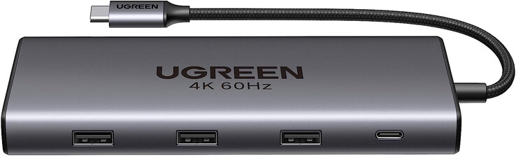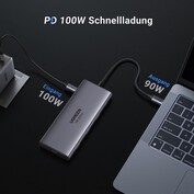Der USB-C-Hub von Ugreen bietet insgesamt neun Anschlüsse. Für die Bildübertragung ist ein HDMI-Port, der eine Ausgabe von bis zu 4K mit 60 Hz ermöglicht, verbaut. Datenübertragungen übernehmen insgesamt vier USB-Anschlüsse, wobei je einmal USB-C und USB-A mit USB 3.2 bis zu 10 Gbit/s schnell arbeiten und zwei weitere USB-A-Ports mit Version 3.0 bis zu 5 Gibt/s ermöglichen. Dazu runden ein Gigabit-Ethernet-Port, zwei Steckplätze für SD/TF-Speicherkarten und ein 100 W USB-C PD-Eingang die Ausstattung der Ugreen 9-in-1 USB-C-Dockingstation ab.