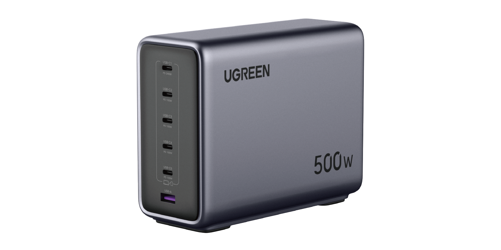 Der neue Ugreen Nexode 500W Desktop Fast Charger ist ein besonders starkes Ladegerät für den Einsatz auf dem Schreibtisch. Es stellt bis zu 500 W zur Verfügung und kann mit seinen sechs Ports, fünfmal USB-C und einmal USB-A, bis zu sechs Geräte zeitgleich mit Energie versorgen. Maximal stehen hierbei 240 W über einmal USB-C zur Verfügung. Die Leistung der anderen Ports beträgt bis zu 100 W (USB-C) bzw. 22,5 W (USB-A), abhängig von der Menge der angeschlossenen Abnehmer.