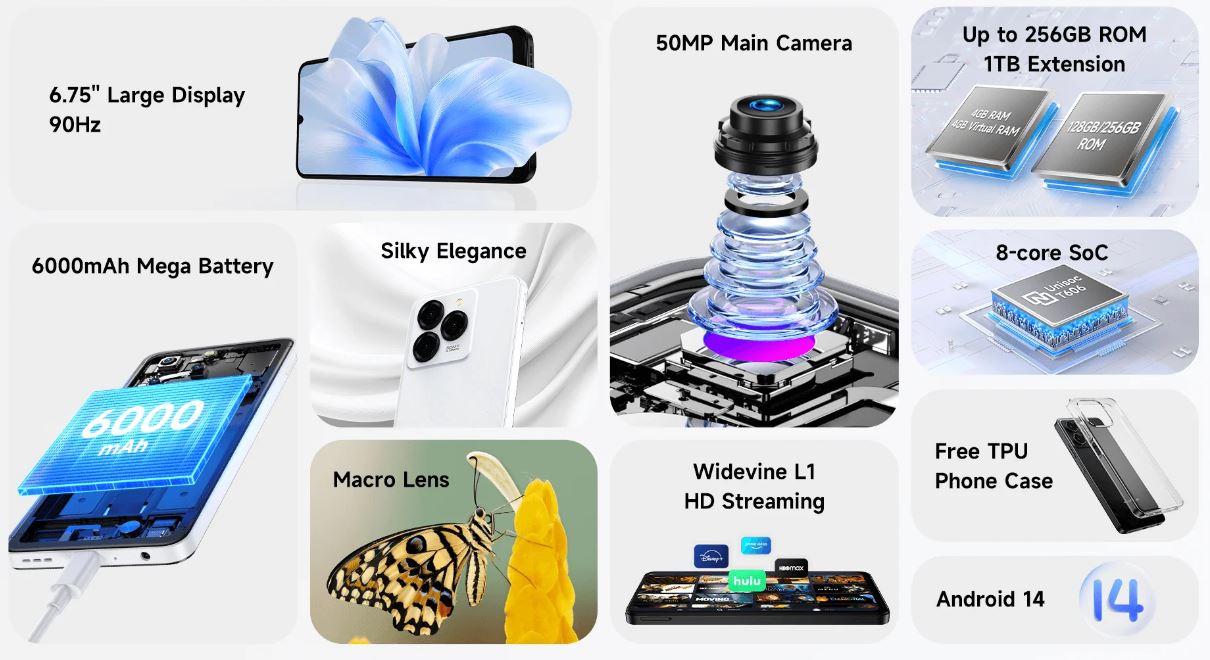 Die Dicke wird auf 9,1 Millimeter beziffert, dabei ist die zusätzliche Dicke des Kamera-Buckels offenbar in dieser Angabe nicht enthalten. Genutzt wird eine Hauptkamera mit 50 Megapixeln und einem Samsung JN1-Sensor, dazu kommt noch eine Makro-Linse mit gerade einmal 2 Megapixeln. Ein Fingerabdrucksensor ist vorhanden und erlaubt die schnelle Anmeldung. Als Betriebssystem kommt Android 14 zum Einsatz, wobei die Installation ohne Werbung oder unnötige Apps kommen soll. Die Datenübertragung mittels USB kann nur langsam und via USB 2.0 stattfinden, ein Klinkenanschluss ist vorhanden.