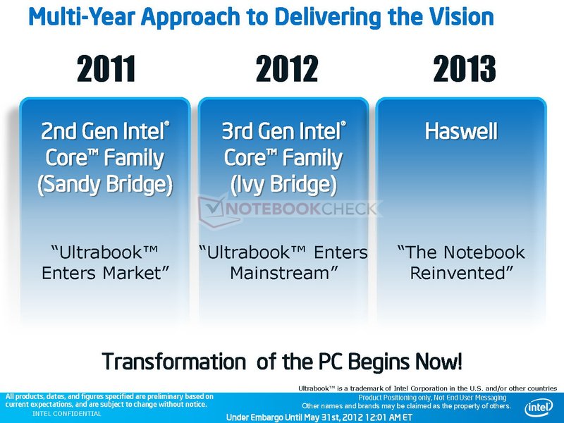 Gemäß taiwanischen Medienberichten soll die 3. Generation von Intels Ultrabooks dann auch mit 3D-Displays und zusätzlichen Sensoren das Kaufinteresse bei den Konsumenten wecken. Wie es in einem Branchenbericht heißt, sollen Intels Ultrabooks der 3. Generation auf dem Ivy-Bridge-Nachfolger Haswell basieren und im 2. Quartal 2013 auf den Markt kommen. An Bord dann neben den hochauflösenden Notebook-Displays mit 3D-Unterstützung, neue Akku-Varianten und flottere SSDs. Auch bei den Chassis soll es Änderungen geben.