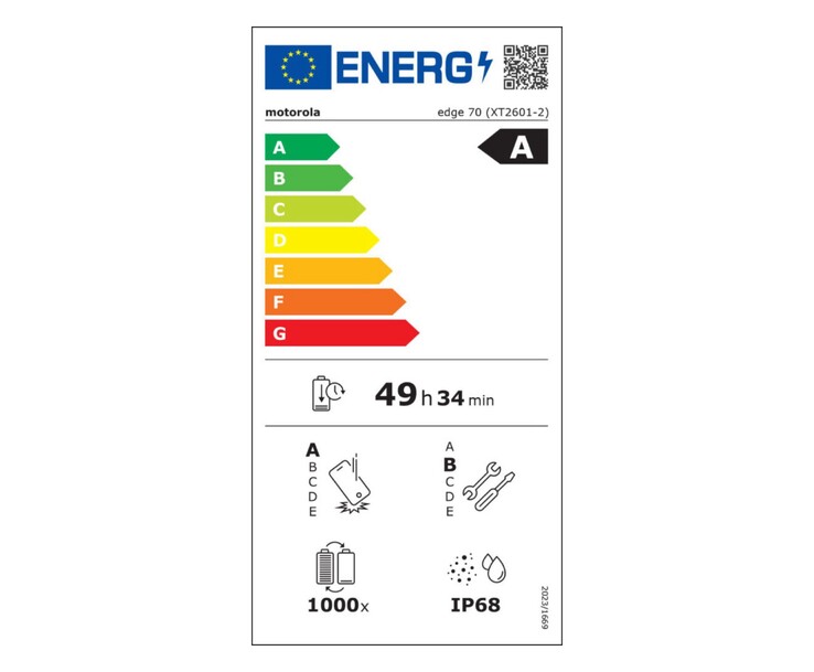 Das Motorola Edge 70 wird vom Hersteller auf der Reparatur-Skala mit einer "B" bewertet, Stürze sollen mit einer "A"-Bewertung vergleichsweise gut überstanden werden. Die Akkulaufzeit wird mit über 49 Stunden beziffert, allerdings sind die Test-Bedingungen, die das EU-Energielabel vorschreibt, nicht besonders anspruchsvoll – das Edge 60 Pro kommt dabei sogar auf mehr als 67 Stunden.