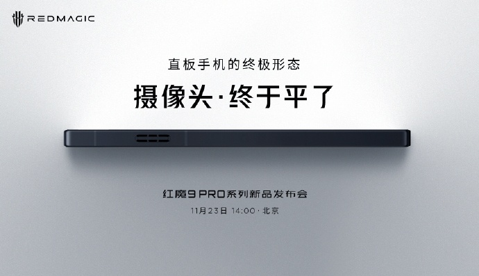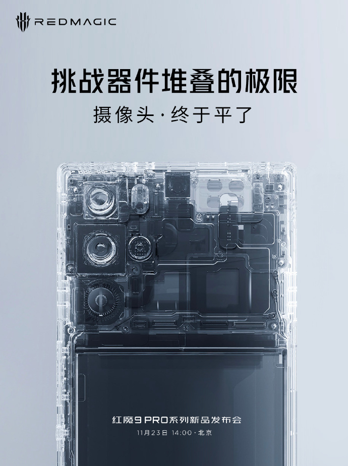 Wie zu erwarten war, hat der Hersteller nun bei Weibo die nächsten Teaser nachgelegt. Die beziehen sich zunächst auf das Design des RedMagic 9 Pro, das durchaus aufzufallen weiß. Wie man nicht ohne Stolz erklärt, präsentiert sich das Gaming-Smartphone im Candybar-Design. Es ist ultraflach und weist keinerlei Kamera-Ausbuchtung auf der Rückseite auf. Stattdessen kommt eine durchgängige Rückseite aus Glas zum Einsatz, die auch als Kameraobjektiv dient.