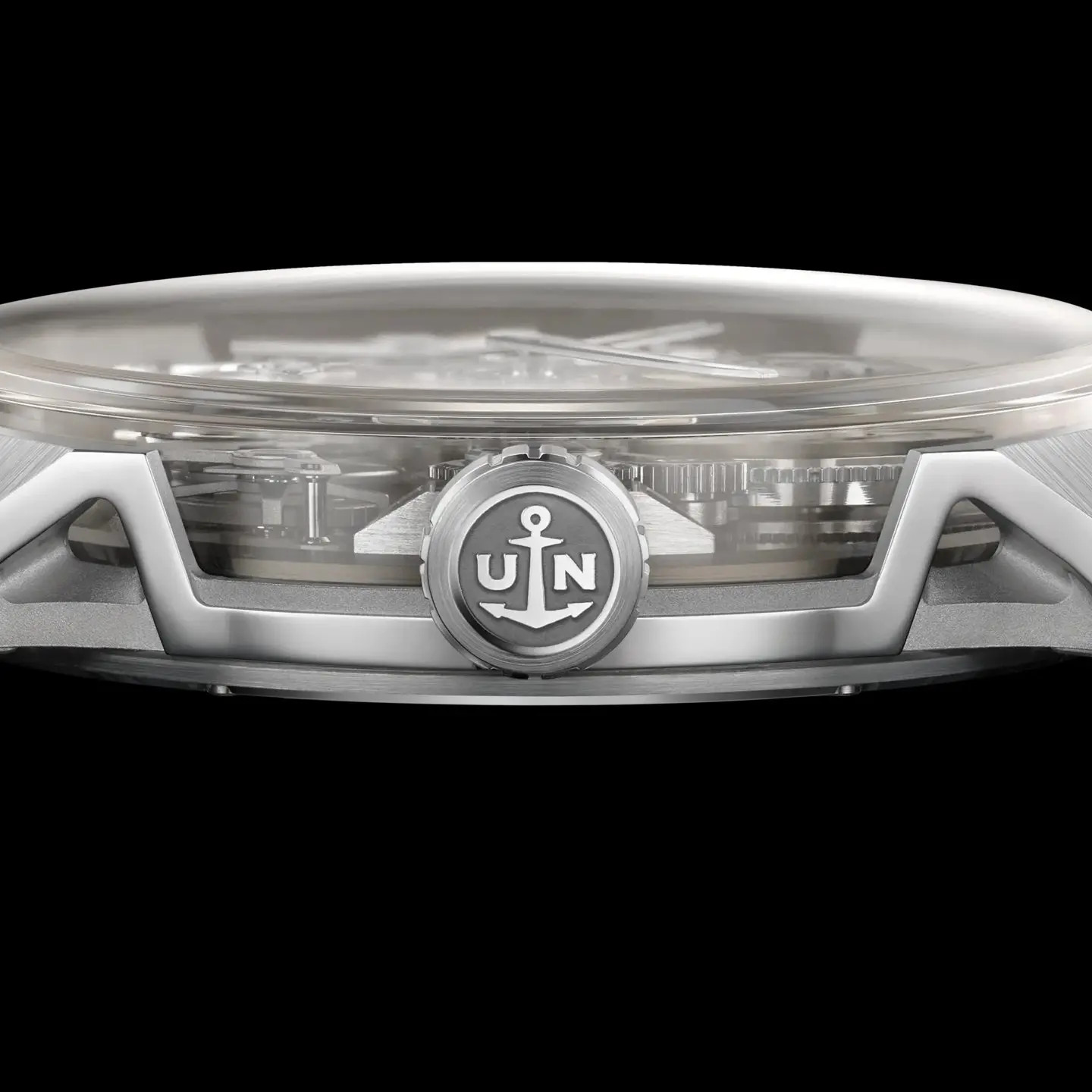 Die Blast Free Wheel Maillechort ist das neueste Modell einer auf 50 Stück limitierten Auflage und basiert auf dem Manufakturkaliber UN-176 mit Handaufzug. Dieses Uhrwerk wurde bereits in früheren Iterationen der Blast-Linie verwendet und hier mit einer Platine aus Alpaka/Maillechort (auch Neusilber genannt) kombiniert.