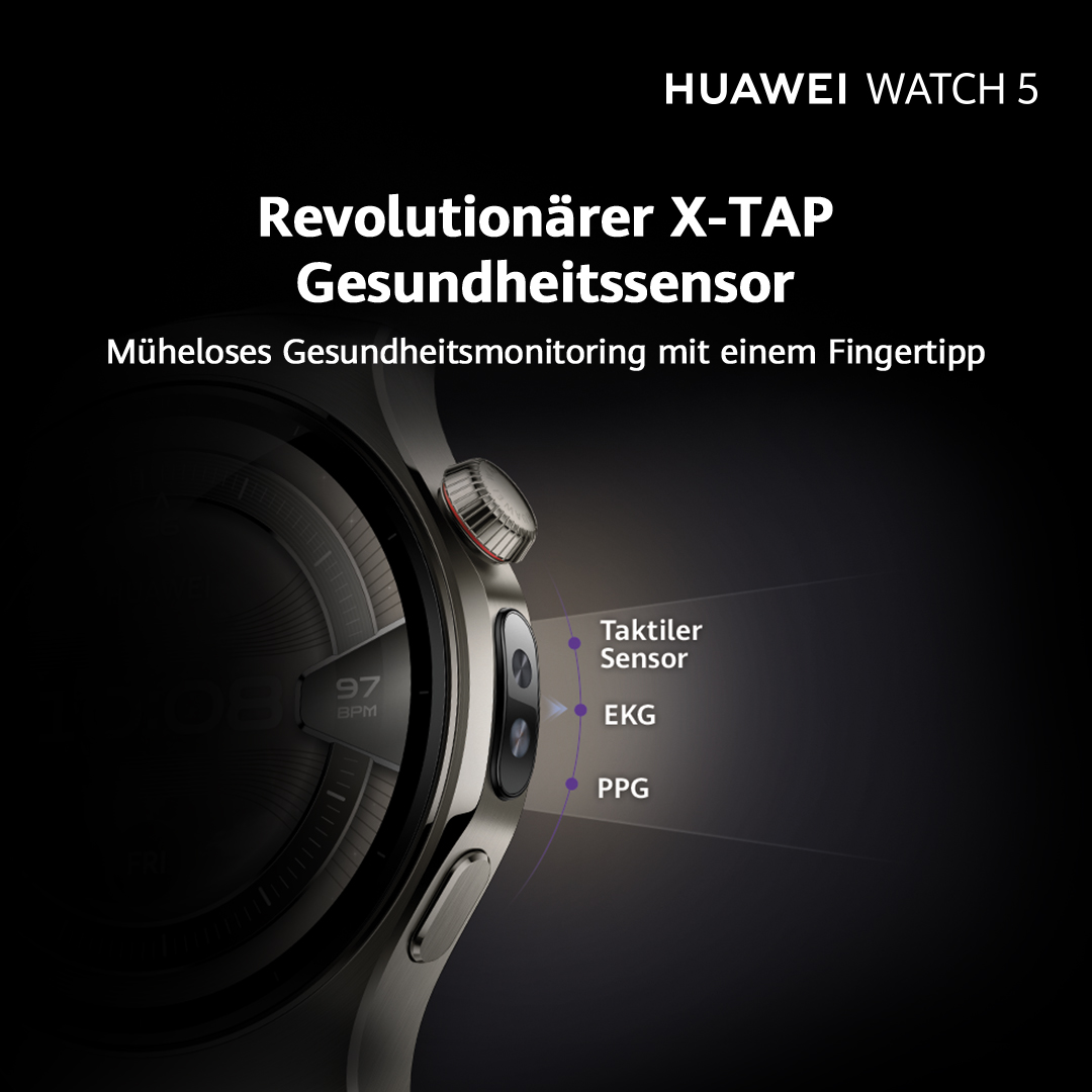 Wichtige Gesundheitsmerkmale überwachen können viele Smartwatches. Die neue HUAWEI WATCH 5 geht aber einen Schritt weiter und einen innovativen Weg. Ausgestattet ist sie mit der brandneuen HUAWEI X-TAP Multisensor-Technologie. Es ist der weltweit erste 3-in-1-Sensor "EKG+PPG+Druck", der einen Drucksensor, EKG-Elektrode und PPG-Sensor kombiniert.