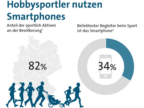 Das Smartphone als Sportbegleiter Nummer 1 wird von 34 Prozent aller Breitensportler genutzt. Bei den Jüngeren unter 29 Jahren sind es sogar 50 Prozent. Wofür wird das Smartphone beim Sport genutzt? 58 Prozent hören damit Musik. Bei den Männern 66 Prozent, bei den Frauen 50 Prozent. Apps zur Leistungsmessung verwenden 57 Prozent. Erfasst werden beispielsweise die gelaufene Strecke, die gefahrene Zeit oder die verbrauchten Kalorien.