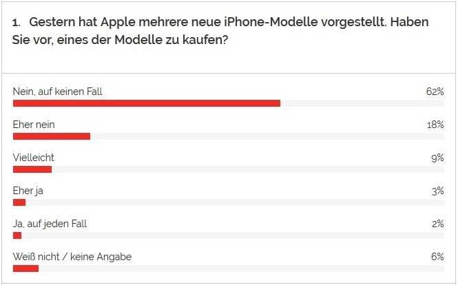 YouGov hat die Stimmung in Deutschland zu den iPhone-Modellen von Apple in einer Umfrage als Trendbarometer ermittelt. Demnach sind sich vier von fünf Deutschen (80 Prozent) einig: Sie werden keines der am vergangenen Mittwoch vorgestellten neuen iPhone-Modelle kaufen. 9 Prozent sind sich nicht sicher und überlegen sich, "vielleicht" eines der neuen iPhone-Handys zu kaufen. Nur 5 Prozent sind sich aktuell absolut sicher und wollen sich tatsächlich ein neues Apple-Smartphone kaufen.