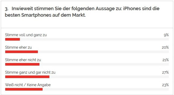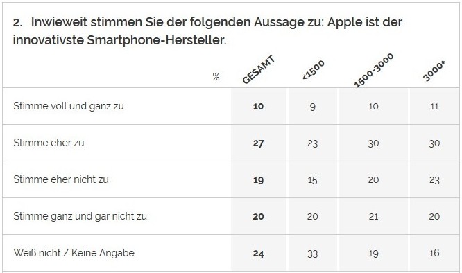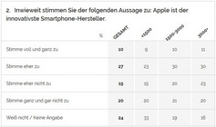 Nur eine Minderheit ist Deutschland der Meinung, dass die iPhones derzeit die besten Smartphones auf dem Markt sind. 29 Prozent stimmen dieser Aussage zu, knapp die Hälfte (48 Prozent) stimmen nicht zu. Auch hier gibt es kaum Unterschiede zwischen den Geschlechtern. Haushalte mit hohem Einkommen halten die iPhones aber tendenziell eher für die besten Smartphones am Markt. Zudem hält eine Mehrheit der Deutschen Apple nicht für den innovativsten Smartphone-Hersteller. Der Aussage "Apple ist der innovativste Smartphone-Hersteller" stimmen 37 Prozent zu. Knapp in der Mehrheit sind mit 39 Prozent diejenigen, die der Aussage nicht zustimmen. 24 Prozent sind unentschieden.