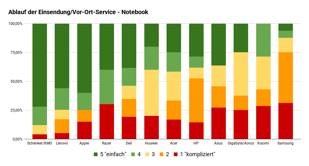Den Ablauf im Servicefall (Einsendung, Pick-up, Vor-Ort) beschrieben Besitzer von Schenker/XMG-Laptops als besonders einfach. Eine überwiegende Anzahl der Teilnehmer sah das auch bei Lenovo, Apple und Razer ähnlich. Verbesserungspotential dürfte es weiterhin vor allem bei Samsung geben. Hier beschrieben rund 75% der Teilnehmer den Ablauf als eher kompliziert bis kompliziert.