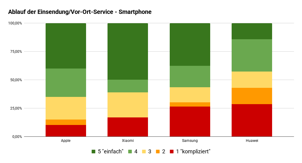 Bei der Reparatur eines Apple-Smartphones berichten rund die Hälfte der Teilnehmer von einer Durchführung innerhalb von 1-3 Tagen. Ebensoviele Huawei-User mussten der Umfrage zufolge mehr als 14 Tage auf ihr Phone warten und auch Samsung zeigt einen hohen Anteil an Reparaturen von 14 Tagen und länger.