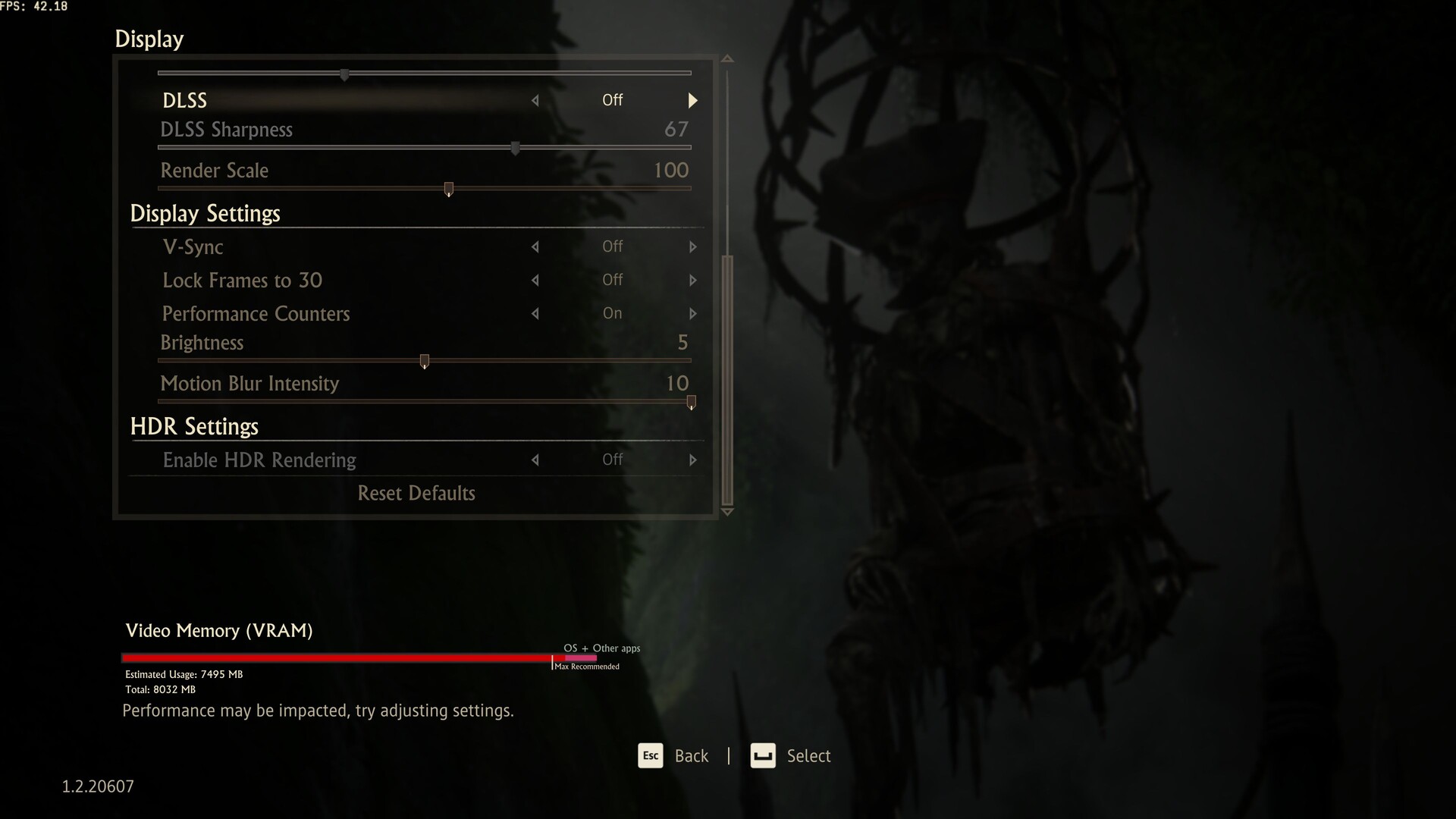Das Grafikmenü hinterlässt gemischte Gefühle. Zwar warten im Advanced-Reiter einige Presets, die löblicherweise ohne Neustart übernommen werden, die Anzahl der Qualitätsregler beschränkt sich allerdings auf 6 (siehe Screenshot). Mehr Optionen finden sich im Display-Menü. Hier warten nicht nur Regler für FSR und DLSS (GPU-abhängig), sondern auch für den Render Scale, V-Sync, die Helligkeit, das Motion Blur und HDR. Dazu gesellen sich eine optionale Framerate-Limitierung auf 30 und eine FPS-Anzeige. Beim Bildmodus stehen leider nur Window und Borderless Window zur Auswahl – ein „echter“ Fullscreen-Mode fehlt.