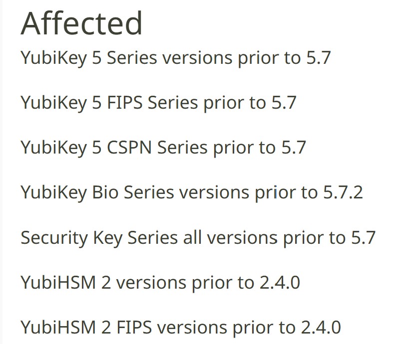 Eine ungepatchte Sicherheitslücke im Schlüssel für die Zwei-Faktor-Authentifizierung von Yubico beeinträchtigt die Sicherheit der meisten Yubikey 5-, Security Key- und YubiHSM 2FA-Geräte. Die Feitian A22 JavaCard und andere Geräte, die TPMs der Infineon SLB96xx-Serie verwenden, sind ebenfalls anfällig. Alle gefährdeten 2FA-Schlüssel sollten als kompromittiert angesehen und so schnell wie möglich durch nicht gefährdete Schlüssel ersetzt werden.