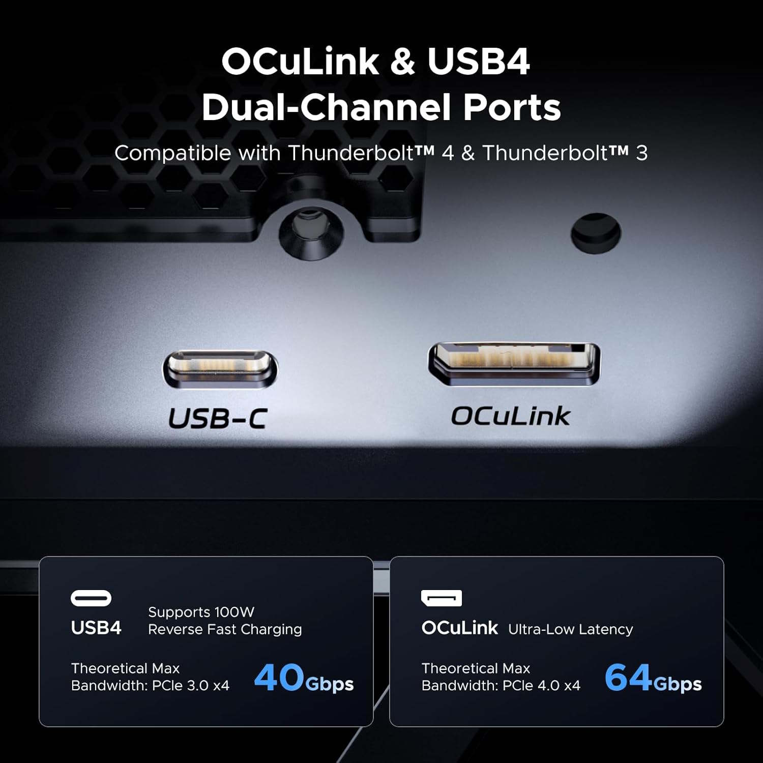 Es können bis zu vier Slots breite und 370 Millimeter lange Grafikkarten genutzt werden. Die Verbindung zu einem Notebook oder Mini-PC ist mithilfe nur eines Kabels möglich, da USB PD mit bis zu 100 Watt unterstützt wird. Allerdings ist diese Art der Verbindung nicht unbedingt ratsam: So lassen sich über USB 4 beziehungsweise Thunderbolt 4 nur bis zu 40 GBit/s übertragen, die Datenübertragungsrate wächst bei Nutzung von OCuLink auf 64 GBit/s.