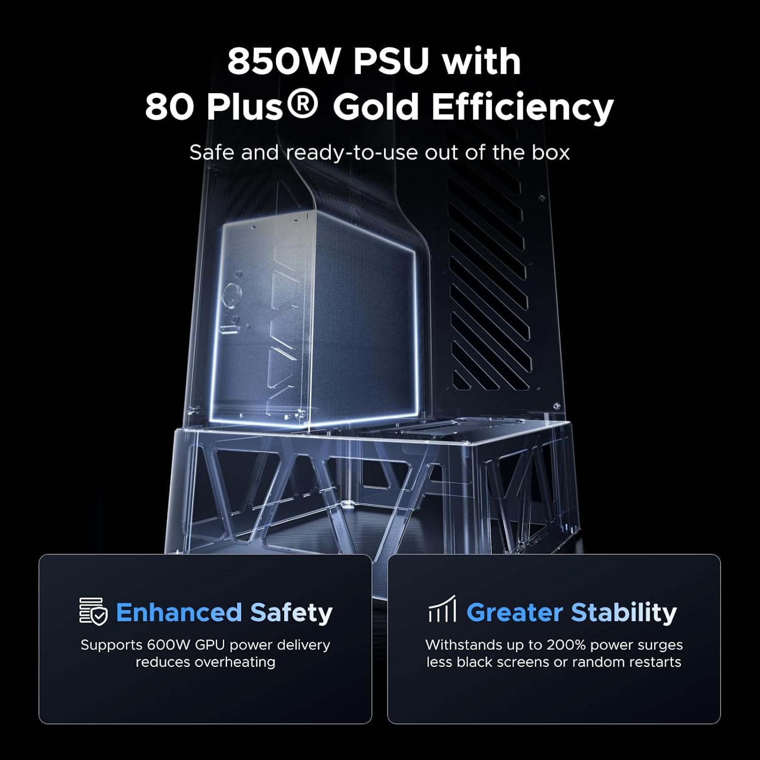 Im Marktumfeld nimmt das System ein wenig eine Zwischenstellung ein: So sind die meisten eGPU-Docks entweder Modelle ohne eine Umhäusung wie die AG02 (bei Amazon) und oft ohne integriertes Netzteil oder Gehäuse mit integriertem Netzteil. Das Ugreen LinkStation eGPU nimmt sozusagen eine Zwischenstellung ein Das Gehäuse ist grundsätzlich offen, allerdings nicht an allen Seiten. Zudem ist ein Netzteil bereits integriert, wobei es sich um ein 80 Plus Gold-Netzteil mit einer Leistung von 850 Watt handelt. Dementsprechend dürfte sich auch anspruchsvolle Grafikkarten angemessen mit elektrischer Energie versorgen lassen, für die Grafikkarte stehen 600 Watt zur Verfügung.
