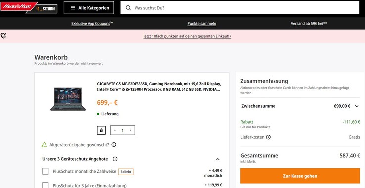 Nachdem wir erst gestern über einen Deal zum Gigabyte G5 Gaming-Laptop samt RTX-4060-Grafik für günstige 756 Euro berichteten, gibts den Budget-Gamer jetzt mit einer GeForce RTX 4050 für unschlagbare 587 Euro versandkostenfrei bei Saturn und Media Markt. Der Deal-Preis wird nach einem Direktabzug von 111 Euro korrekt im Warenkorb angezeigt. Der nächstgünstige Laptop mit RTX-4050-Grafik kostet aktuell ganze 300 Euro mehr.