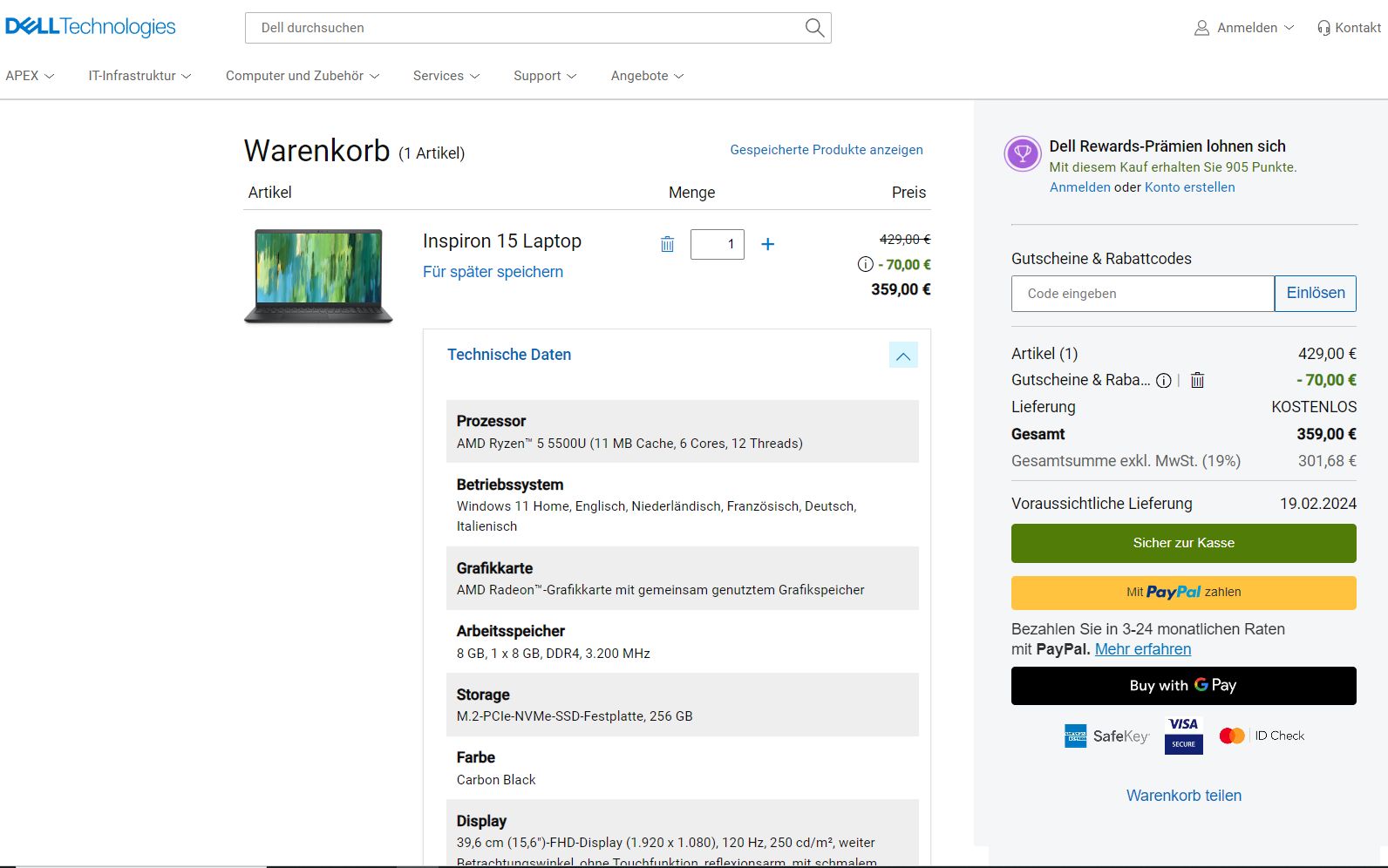 Bei Dell gibts gerade für besonders günstige 359 Euro das Inspiron 15 Office-Notebook mit erweiterbarem RAM, AMD Ryzen 5 und 120 Hz schnellem Display. Viele Office-Notebooks setzen in dieser Preisklasse stattdessen auf komplett verlöteten Arbeitsspeicher und bieten nahezu immer eine 60-Hz-Bildwiederholrate. Um auf den Deal-Preis zu kommen, gibt man im Warenkorb den Rabattcode "MDINSPI70" ein. Das Angebot endet morgen Mitternacht, den 16.02.2024.