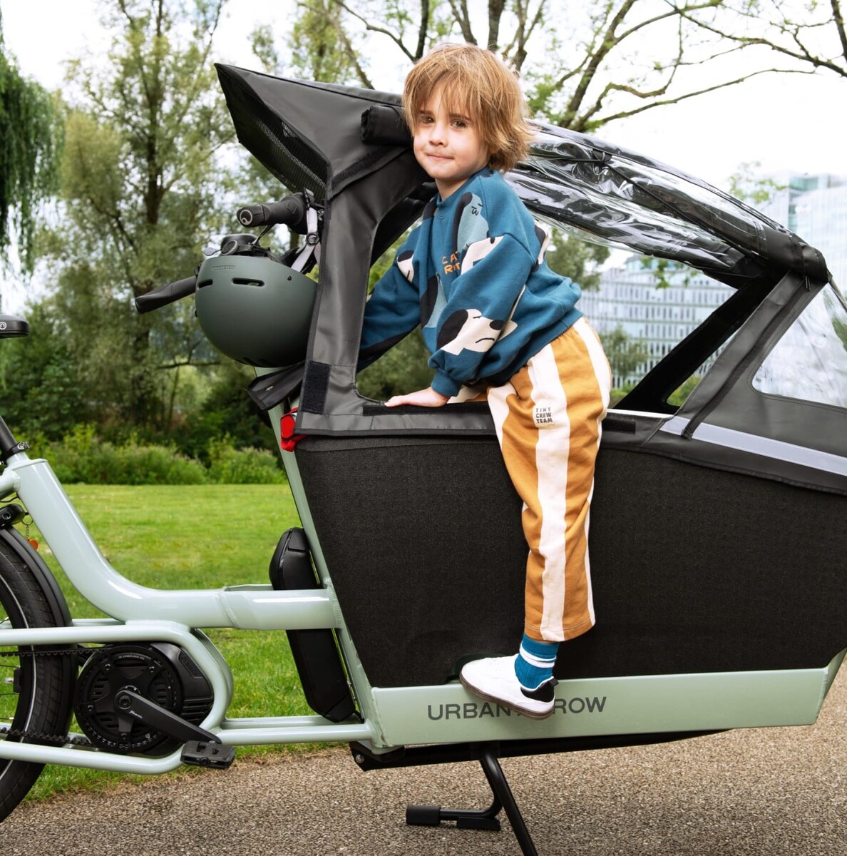 Wählbar ist auch die Schaltung, je nach Version kann das Lastenfahrrad auch mit einer Enviolo AutomatiQ geordert werden - ein Carbonriemen und eine stufenlose Enviolo-Schaltung zählen aber immer zur Ausstattung. Die Mobie34 CGO-Boost-Federgabel stammt von Suntour, genutzt werden ein Bosch Kiox 300-Display und eine LED Remote. Bestellbar ist noch verschiedenes Zubehör, so etwa eine zweite Sitzbank oder ein Adapter für einen Babysitz und ein Regenverdeck. Montierbar ist noch ein Heckgepäckträger, damit lassen sich dann Personen und Gepäck gleichzeitig einfach mitnehmen.