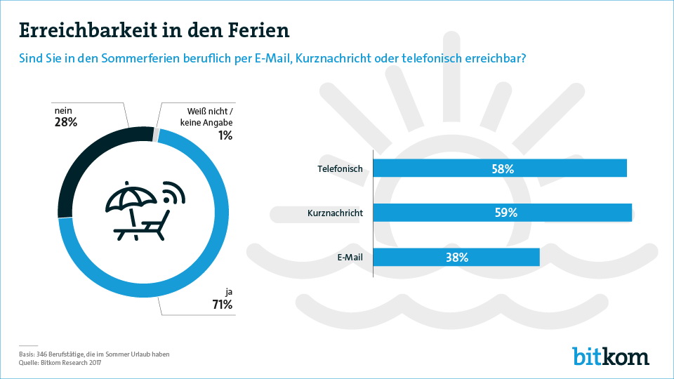 Wie der Bitkom aus der Umfrage zitiert, sind 71 Prozent der Berufstätigen in Deutschland auch im Urlaub beruflich per E-Mail, telefonisch oder per Kurznachricht erreichbar. Damit sei die Erreichbarkeit der Arbeitnehmer im Vergleich zum Vorjahr 2016 (67 Prozent) leicht gestiegen. 59 Prozent lesen in den Ferien regelmäßig Kurznachrichten wie iMessage und WhatsApp. Mit 58 Prozent sind praktisch ebenso viele telefonisch erreichbar. 38 Prozent der Befragten lesen geschäftliche E-Mails.