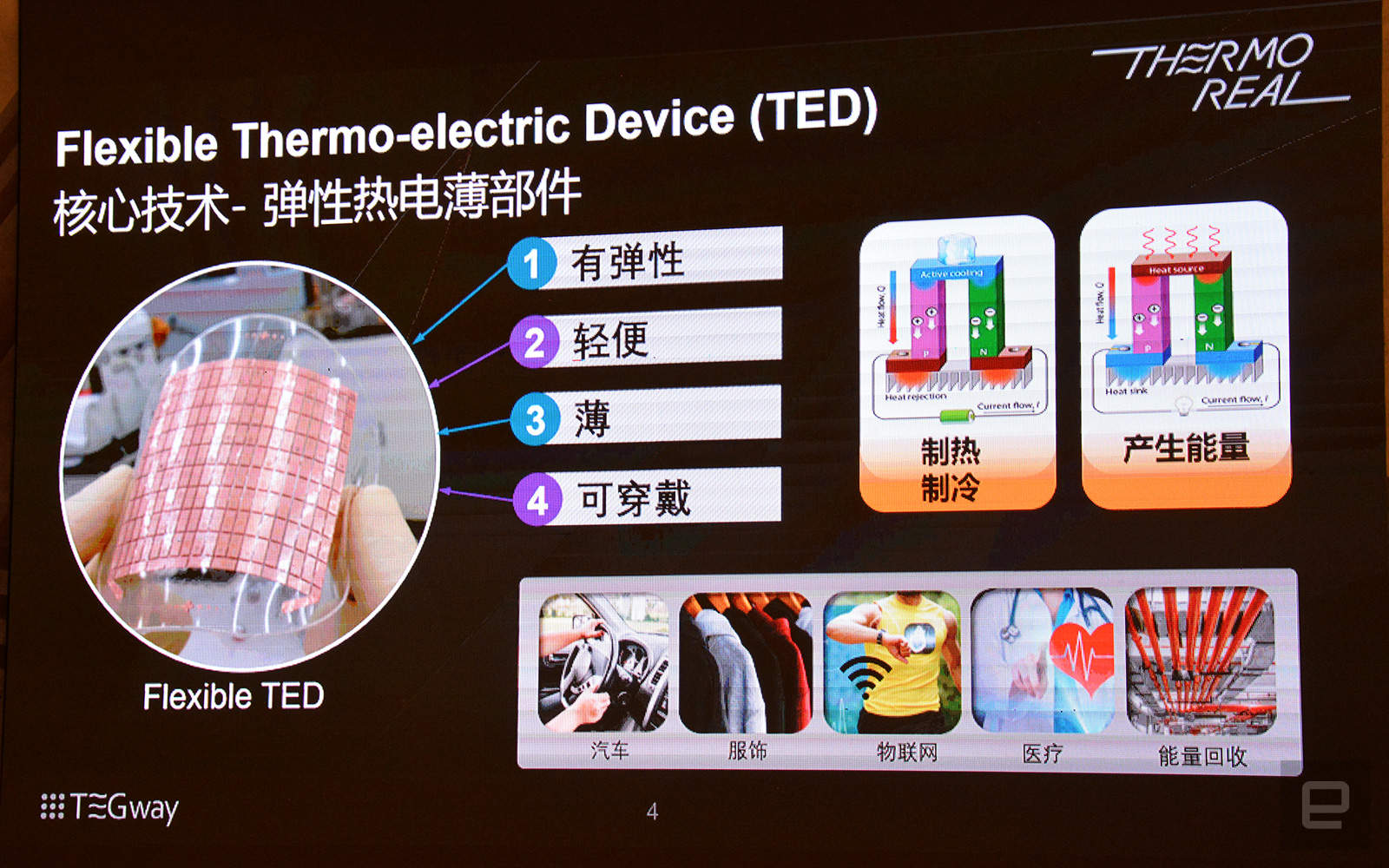 TEGway, ein Ableger des „Korea Advanced Institute of Science and Technology“, hat ein flexibles, thermo-elektrisches Gerät (TED) produziert. ThermoReal kann punktuell in verschiedenen Zonen extrem schnell aufheizen oder abkühlen. Es ist sogar möglich das Gerät gleichzeitig in verschiedenen Zonen erhitzen und erkalten zu lassen.
