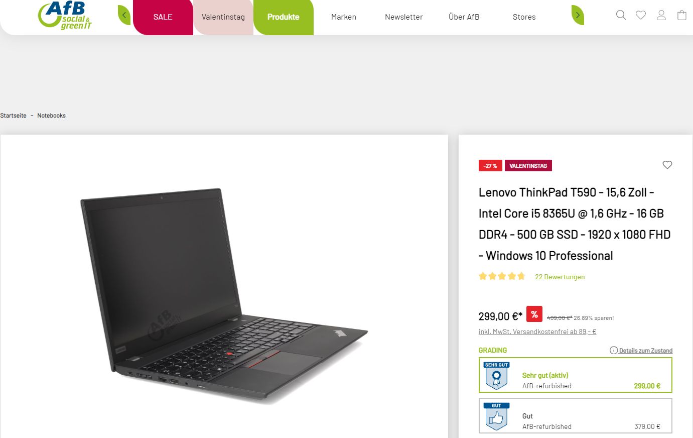 Zum Valentinstag ist es noch etwas hin, aber bereits jetzt bietet der AfB-Shop entsprechende Valentins-Deals an, unter Anderem das Lenovo ThinkPad T590 Business-Notebook, das es mit 16 GB RAM und einer 512 GB SSD aktuell für günstige 299 Euro gibt.