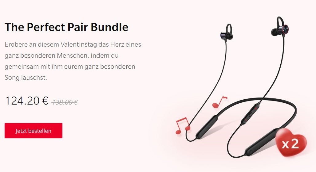 Wer noch kein OnePlus 6T sein eigen nennt und sich auch für die Bullets Wireless-Ohrhörer der Chinesen interessiert, kann aktuell 20 Euro sparen, wenn er oder sie die Valentinstags-Aktion nutzt, bei der beide Produkte gemeinsam um 630 Euro abgegeben werden. Das klingt jetzt zwar nicht gerade nach einem idealen Bundle für Verliebte sondern eher was für enttäuschte Singles, aber auch für ein menschliches Duo hat OnePlus anlässlich des diesjährigen Valentinstags am 14. Februar etwas im Angebot. Mit dem "Perfect Pair Bundle" werden zwei Bullets Wireless-Ohrhörer zusammen um knapp 125 statt um 138 Euro abgegeben. Beide Angebote gibt es exklusiv im OnePlus-Onelineshop.