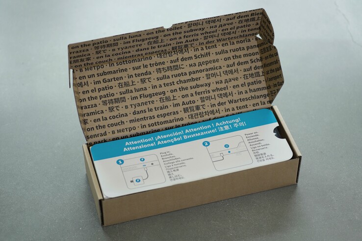 Öffnet man die Box, so findet man auf der Innenseite des Deckels Hinweise darauf, wo und in welchen Sprachen man mit dem Steam Deck zocken kann, etwa auf der Couch, im Garten, auf einem Schiff oder in der U-Bahn. Eine Kurzanleitung zeigt, wie das USB-C-Kabel zum Aufladen angesteckt wird, und wie man das Steam Deck einschaltet.