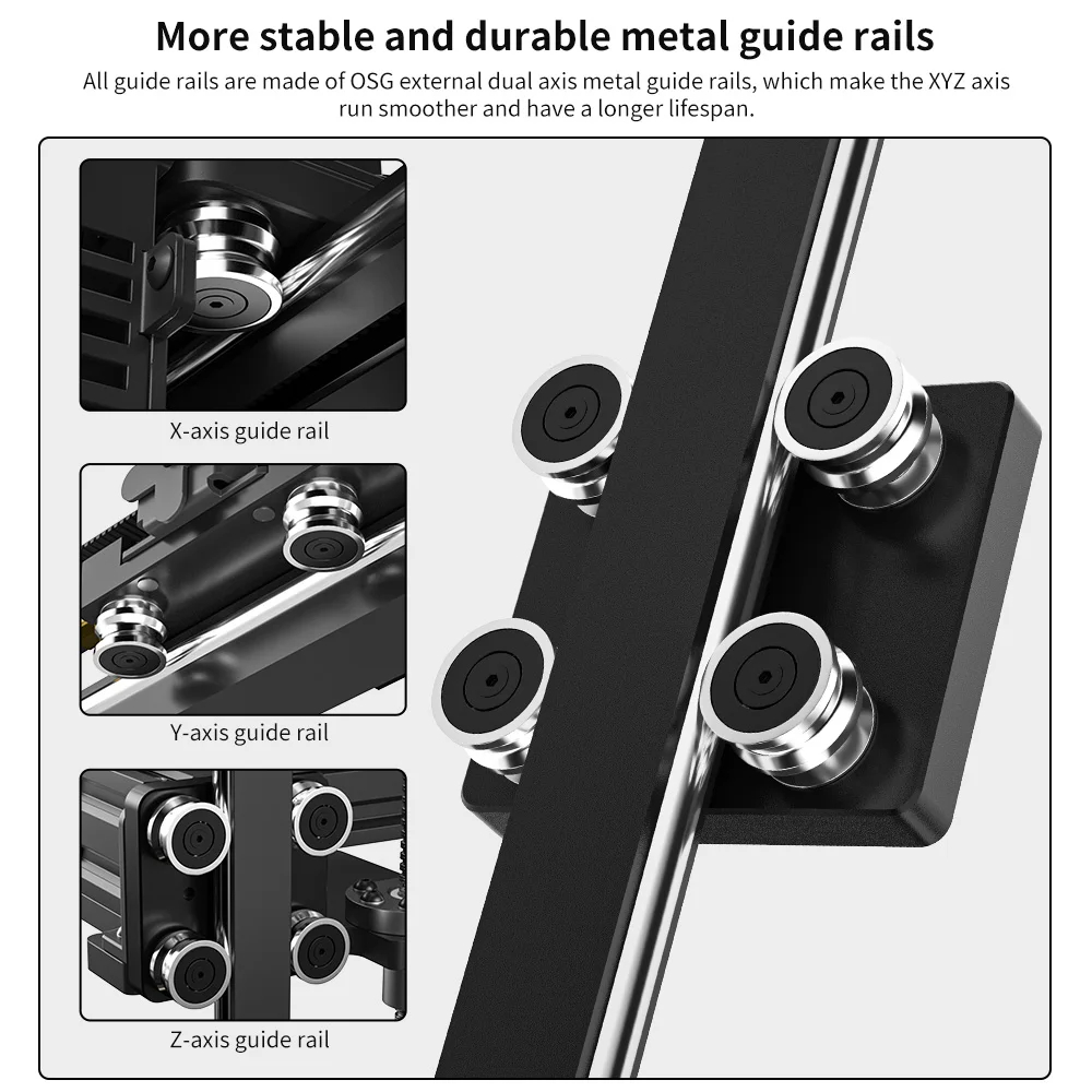 Das Druckbett des offenen Druckers lässt sich auf bis zu 100 °C beheizen, die Druckdüse auf bis zu 325 °C. Es wird eine zwischen 0,2 und 0,4 Millimeter große Druckdüse unterstützt, die Druckgeschwindigkeit wird mit zwischen 20 und 150 Millimetern in der Sekunde angegeben - empfohlen werden 60 mm/s. Das Leveling soll automatisch erfolgen, nach einem Stromausfall lässt sich der Druck fortsetzen. Ein Filament-Detektor ist vorhanden.