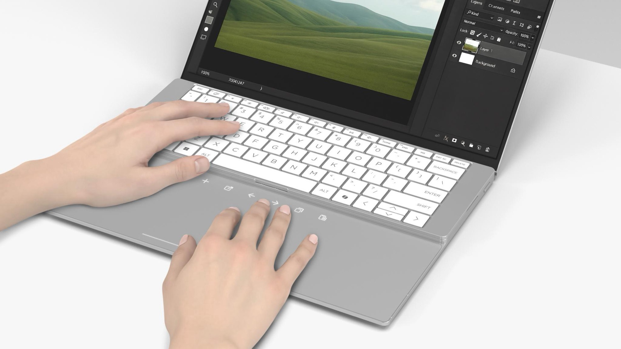 Soll doch ein Trackpad genutzt werden, kann die Tastatur kurzerhand angehoben und auf die obere Hälfte der Basis gestellt werden – unter der Transport-Position der Tastatur verbirgt sich ein großes Multitouch-Trackpad. Da so kein Platz für die Tastatur in der hinteren Hälfte des Laptops eingeplant werden muss, soll zusätzlicher Platz für ein Kühlsystem mit zwei Lüftern und für einen Akku geschaffen werden, ohne den Laptop dicker gestalten zu müssen.