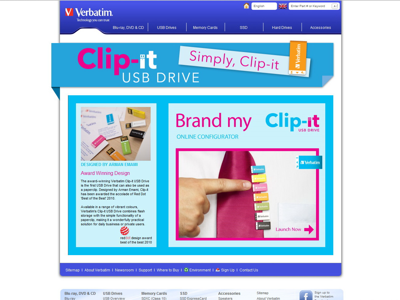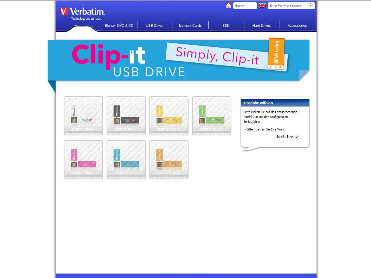 Das Konfigurationstool auf der Website von Verbatim lässt den Benutzer dabei kinderleicht in ein paar Schritten zum Ziel kommen: Farbe des Clip-it festlegen. Dabei kann der Kunde zwischen den leuchtenden Signalfarben Grün, Gelb, Pink, Blau und Orange sowie den Klassikern Schwarz und Weiß wählen. Im nächsten Schritt kann dann bereits das Logo oder der Text eingefügt werden.