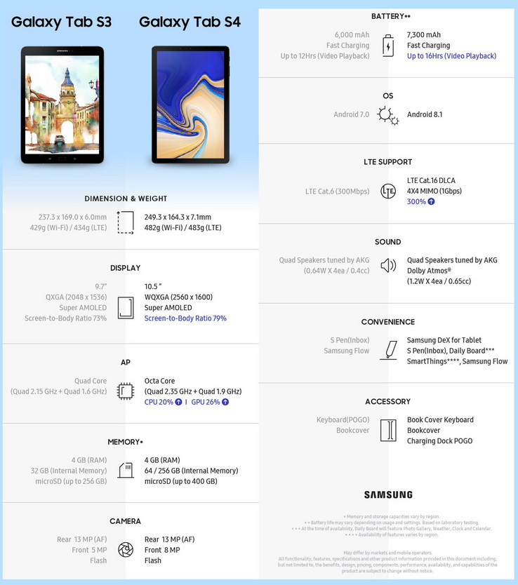 Samsung hat in einem Vergleich die beiden Modelle Galaxy Tab S3 vs. Galaxy Tab S4 als Alt gegen Neu gegenüber gestellt. Wie die Infographics zeigt, ist das neue Tab S4 mit 249,3 Millimetern etwas länger (Tab S3: 237,3 mm) und mit 7,1 Millimetern auch dicker als das Tab S3 mit 6,0 mm. Auch das Gewicht des Galaxy Tab S4 beträgt nun modellabhängig 482 Gramm (Wi-Fi) respektive 483 Gramm (LTE). Das sind etwa rund 50 Gramm mehr als bei der Tab-S3-Generation.