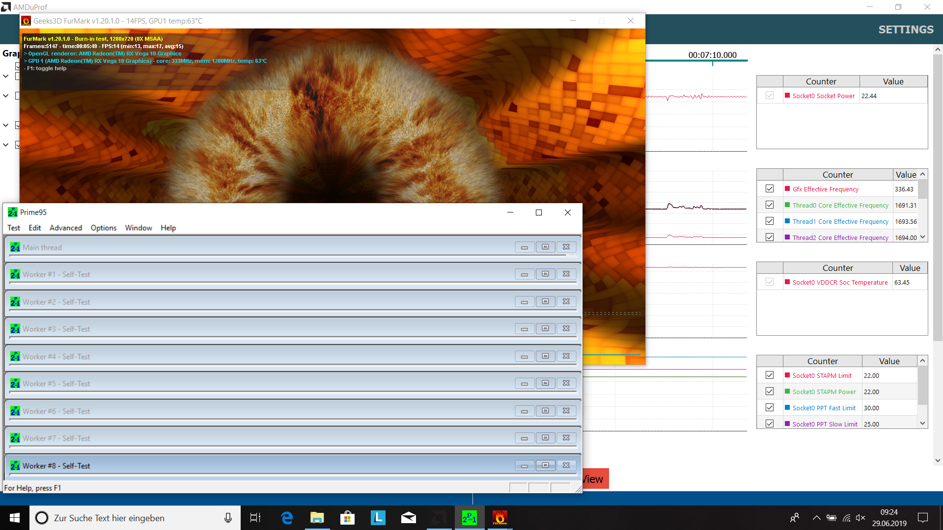 Beim AMD Ryzen 7 3700U lag die gemessene Temperatur bei 63,4 °C, wenngleich hier eine durchschnittliche Taktrate von 1,8 GH während des Lasttests erreicht wurde.