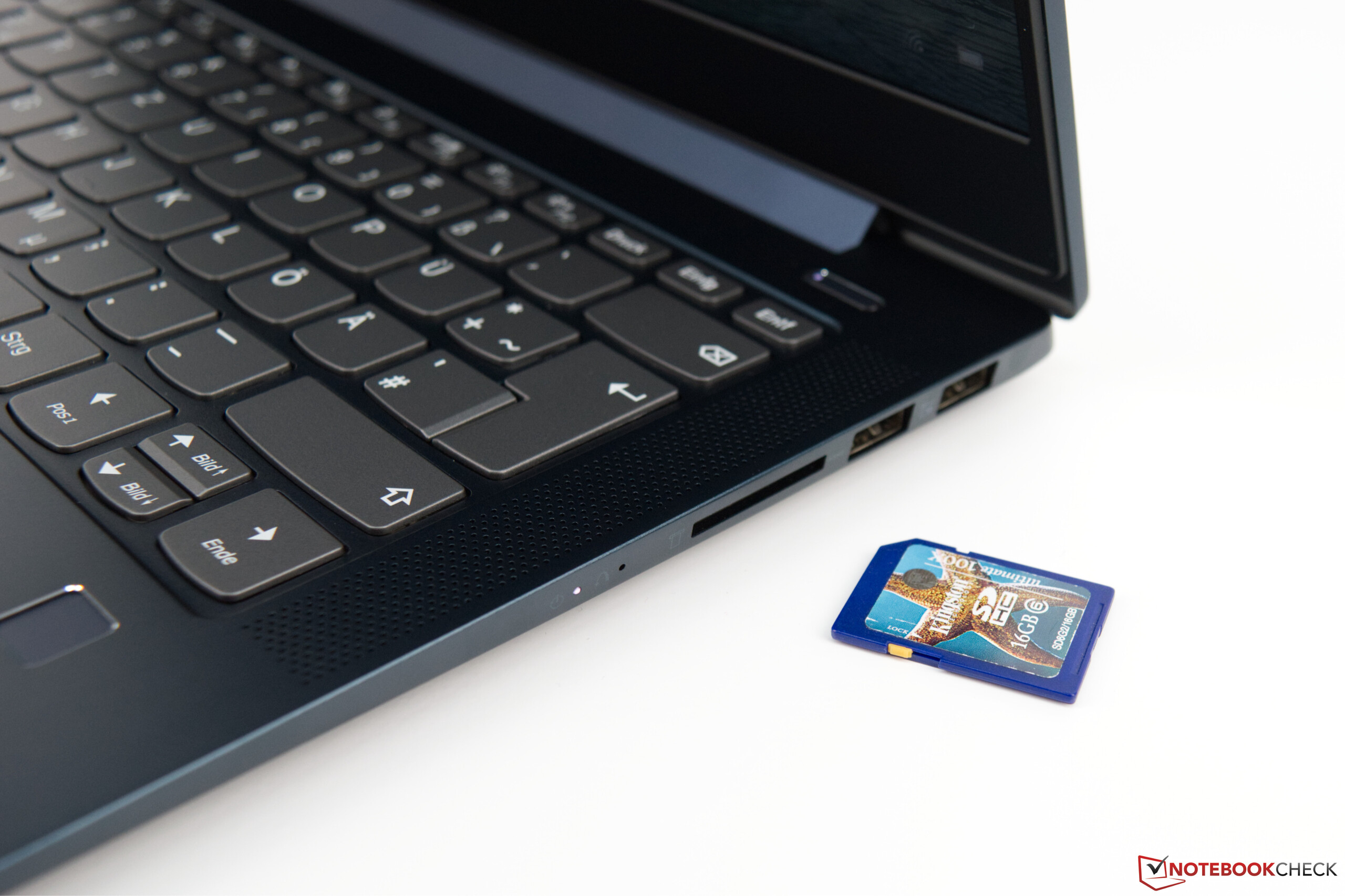 Wie eben schon erwähnt, bietet Lenovo auch das IdeaPad S540 noch mit einem SD-Kartenleser an. Dieser kann auch große SD-Speicherkarten aufnehmen. Allerdings ragen eingelegte Datenträger deutlich aus dem Schacht hervor. Mit unserer Referenzspeicherkarte (Toshiba Exceria Pro SDXC 64 GB UHS-II) haben wir die Leistung geprüft und wie aus der Tabelle zu entnehmen ist, arbeitet der Speicherkartenleser mit USB-3-Geschwindigkeit. Hier im Test konnte das Lenovo IdeaPad S540-14IWL sogar den ersten Platz ergattern und das IdeaPad S540-14API auf den zweiten Platz verweisen. Auch das IdeaPad S340 arbeitet mit einem ähnlich schnellen Kartenleser. Die beiden anderen Vergleichsgeräte besitzen nur einen Speicherkartenleser, welcher über USB-2.0 angebunden ist, somit haben die beiden keine Chance auf einen besseren Platz.