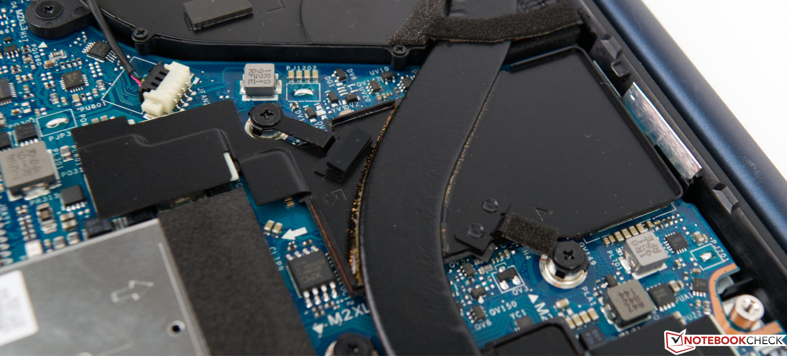 Wartungsarbeiten sind bei dem Lenovo IdeaPad S540 nicht schnell erledigt. Eine Wartungsklappe gibt es nicht, weshalb einem nur die Demontage der Bodenplatte übrigbleibt, wenn man an das Innenleben möchte. Dies sollte jedoch vorsichtig gemacht werden, um etwaige Beschädigungen an der Base zu vermeiden. Nach dem Entfernen der zahlreichen Schrauben sitzt die Abdeckung noch immer fest an der Base. Um diese zu lösen, empfehlen wir geeignetes Hebelwerkzeug aus Kunststoff zu verwenden. Nachdem die Abdeckung nun entfernt wurde, hat man Einblick ins Innere. Dabei fällt auf, dass beide Geräte ähnlich strukturiert sind. Beide sind mit einer Dual-Fan-Kühleinheit ausgestattet, welche sich gut reinigen lässt. Der Arbeitsspeicher ist zum einen verlötet (4 GB), aber durch ein zusätzliches 4-GB-Modul arbeitet dieser im Dual-Channel-Modus. Ein Erweitern ist auf bis zu 20 GB möglich. Ein freier M.2-2242-Steckplatz ist noch vorhanden und kann für einen weiteren Datenträger genutzt werden.