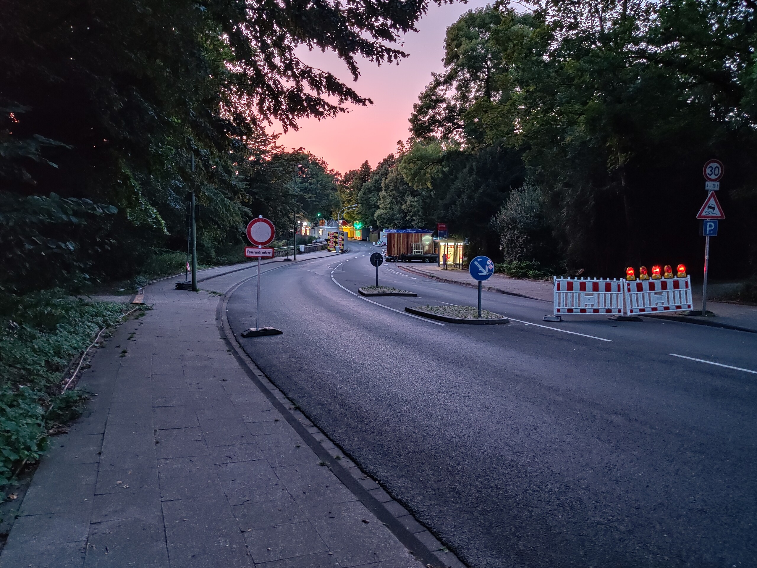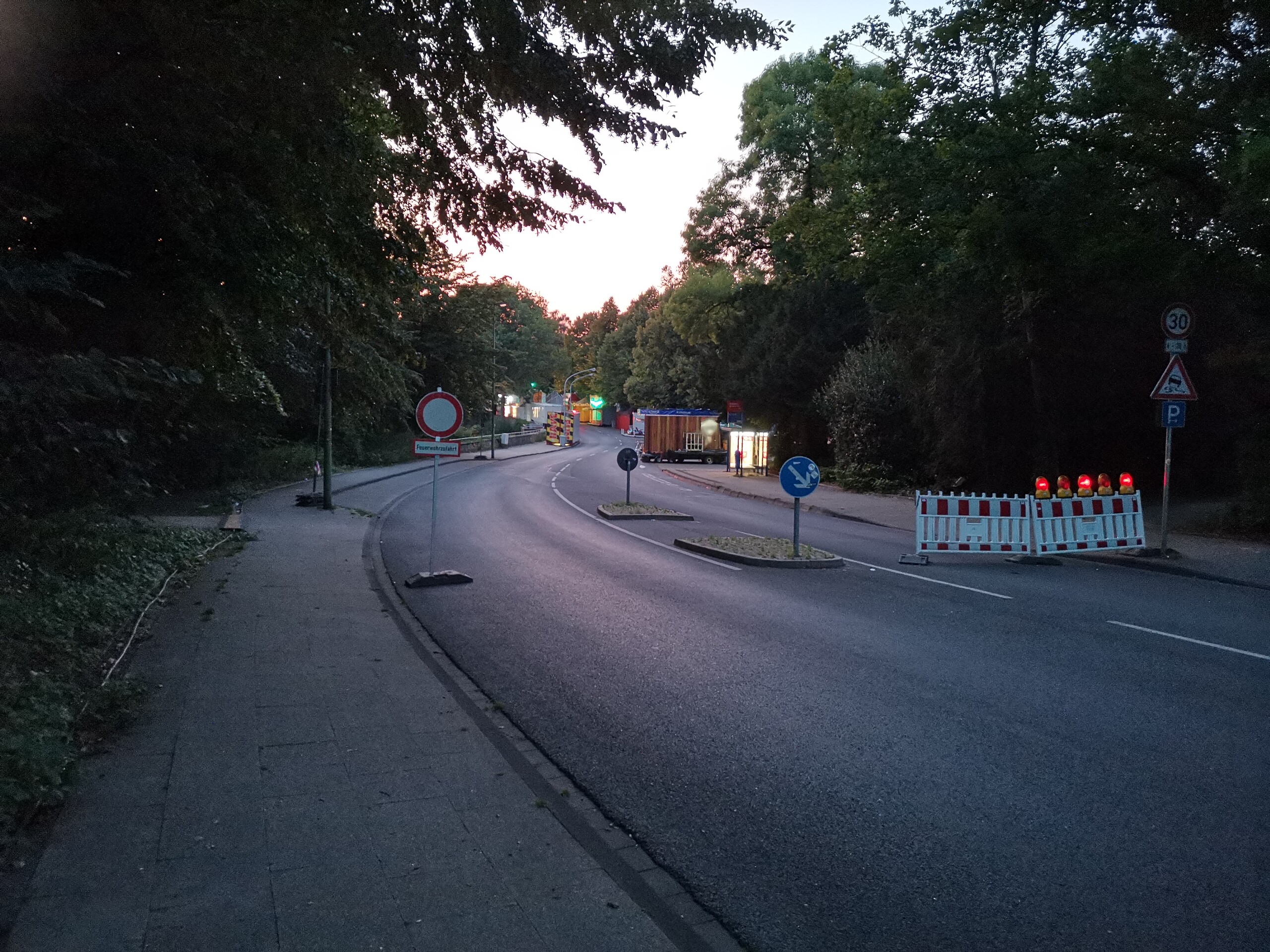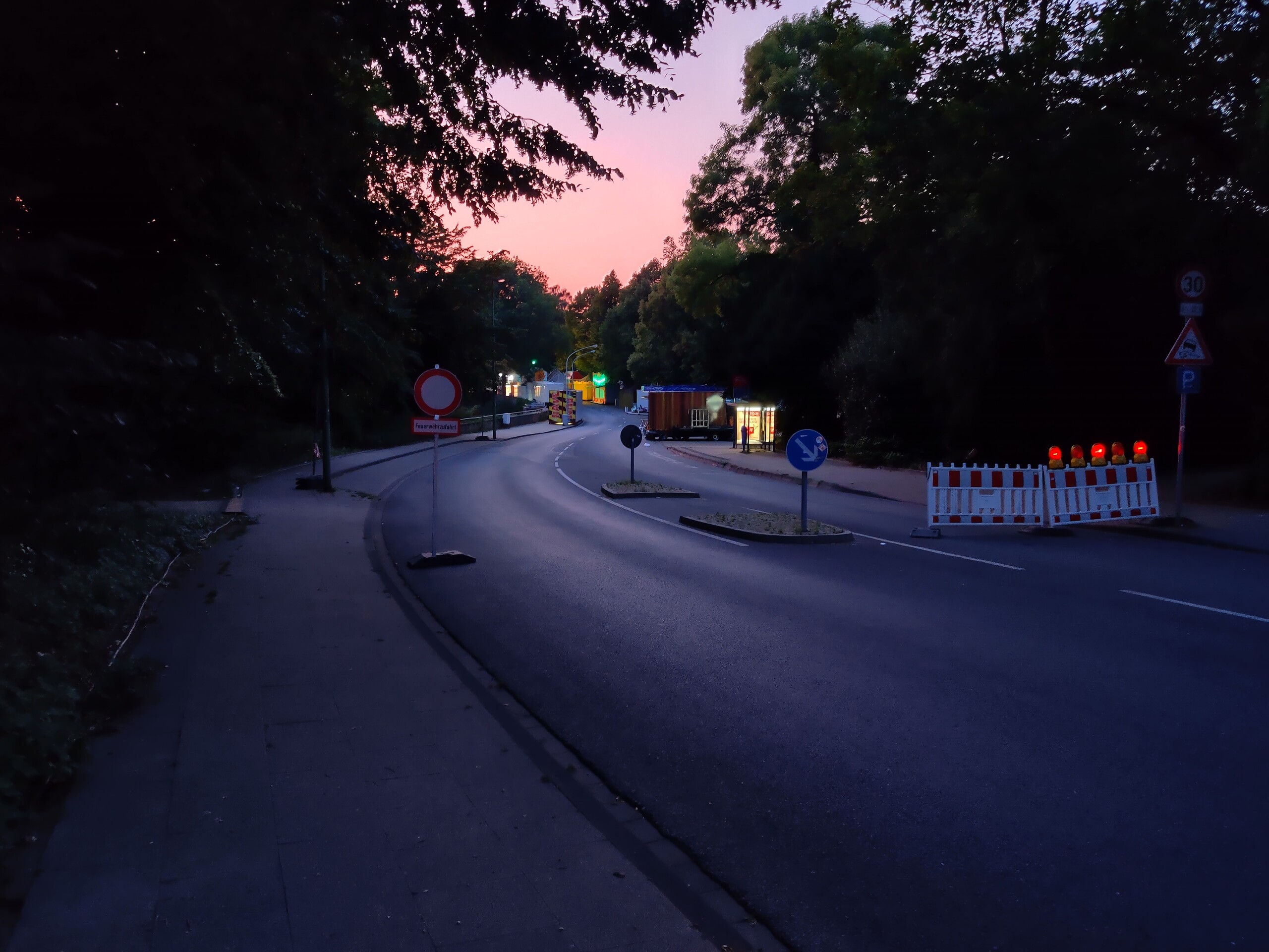 Die Aufnahmen bei Dämmerung haben wir zunächst im Abstand von rund einer halben Stunde gemacht und im Anschluss jeweils eine weitere mit den Nachtmodus. Bei der frühesten Bildreihe gefällt uns das Resultat des ZenFones am besten. Es besitzt viel Dynamik und selbst vom Baumlaub werden noch viele Details eingefangen, nur der Himmel ist stellenweise ein wenig zu dunkel. OnePlus und ZTE gelingen ebenfalls gute Aufnahmen, während das Mi 9 und vor allem das View 20 bereits Probleme haben die Konturen der Bäume sauber einzufangen, vor allem beim Honor bildet sich gut sichtbarer Pixelmatsch im Blattwerk.