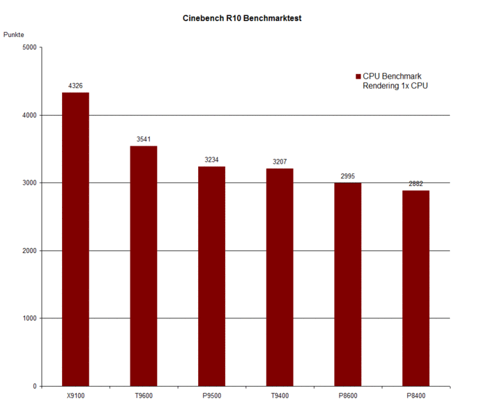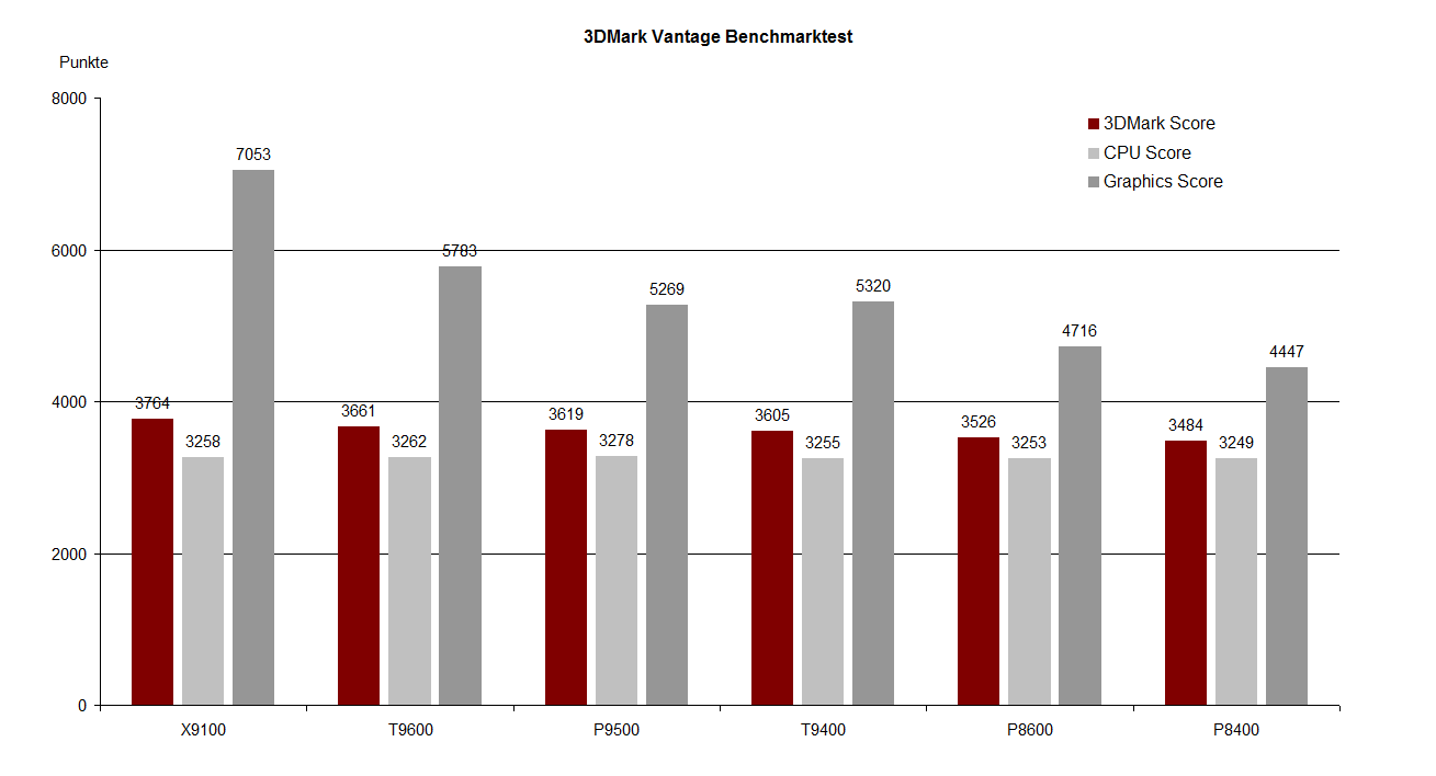 Auffällig sind in dieser Hinsicht vor allem die P9500 und die T9400 CPU, die sich abgesehen von ihrem TDP Wert nicht voneinander unterscheiden. Hier kann davon ausgegangen werden, dass es sich um den grundsätzlich selben Chip handelt, der jedoch aufgrund möglicher Fertigungstoleranzen einmal in die Kategorie unter 25W und ein anderes Mal über 25W fallen kann. Der von Intel angegebene TDP Wert bei der T9400 CPU von 35W ist damit als möglicher „Worst-Case“ für den Chip zu verstehen.