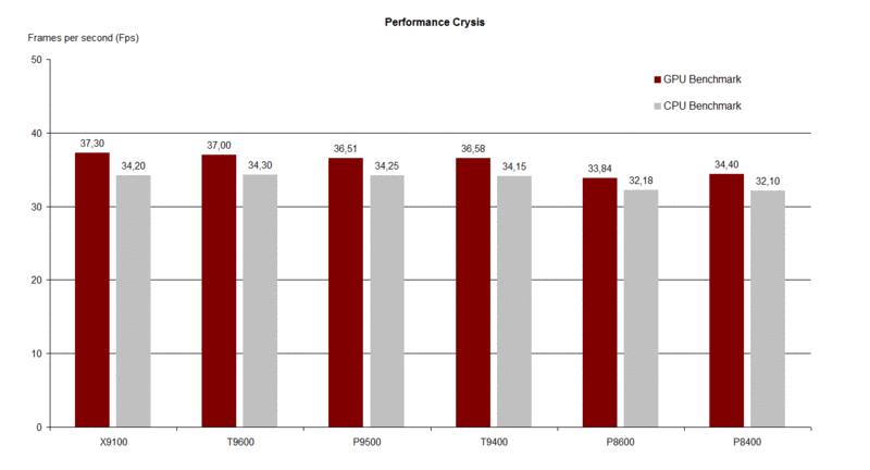 Der im Spiel integrierte Performance Test liefert neben einem Gesamt Score auch eine durchschnittliche Bildwiederholungsrate während des Durchlaufes einer gescripteten Multiplayerschlacht aus. Anhand der Ergebnisse ist ein leichtes Absacken der Performance bis hin zur T9400 CPU zu beobachten, um letztlich bei der P8400 und P8600 CPU in etwa konstant zu bleiben. Bei einer Auflösung von 1280x800 Pixel mit hohen Grafik Presets fällt der feststellbare Unterschied hinsichtlich Fps-Rate von rund 31 bis 33 Fps zwar nur marginal aus, erfahrungsgemäß macht sich eine leistungsfähige CPU vor allem dann bezahlt, wenn man ohne Einheitenlimit spielt, und von seinen Gegnern mit Low-Tech Bots gespamt wird. Im Performance Test bleibt die Zahl der Einheiten dabei im vergleichsweise niedrigen Bereich.