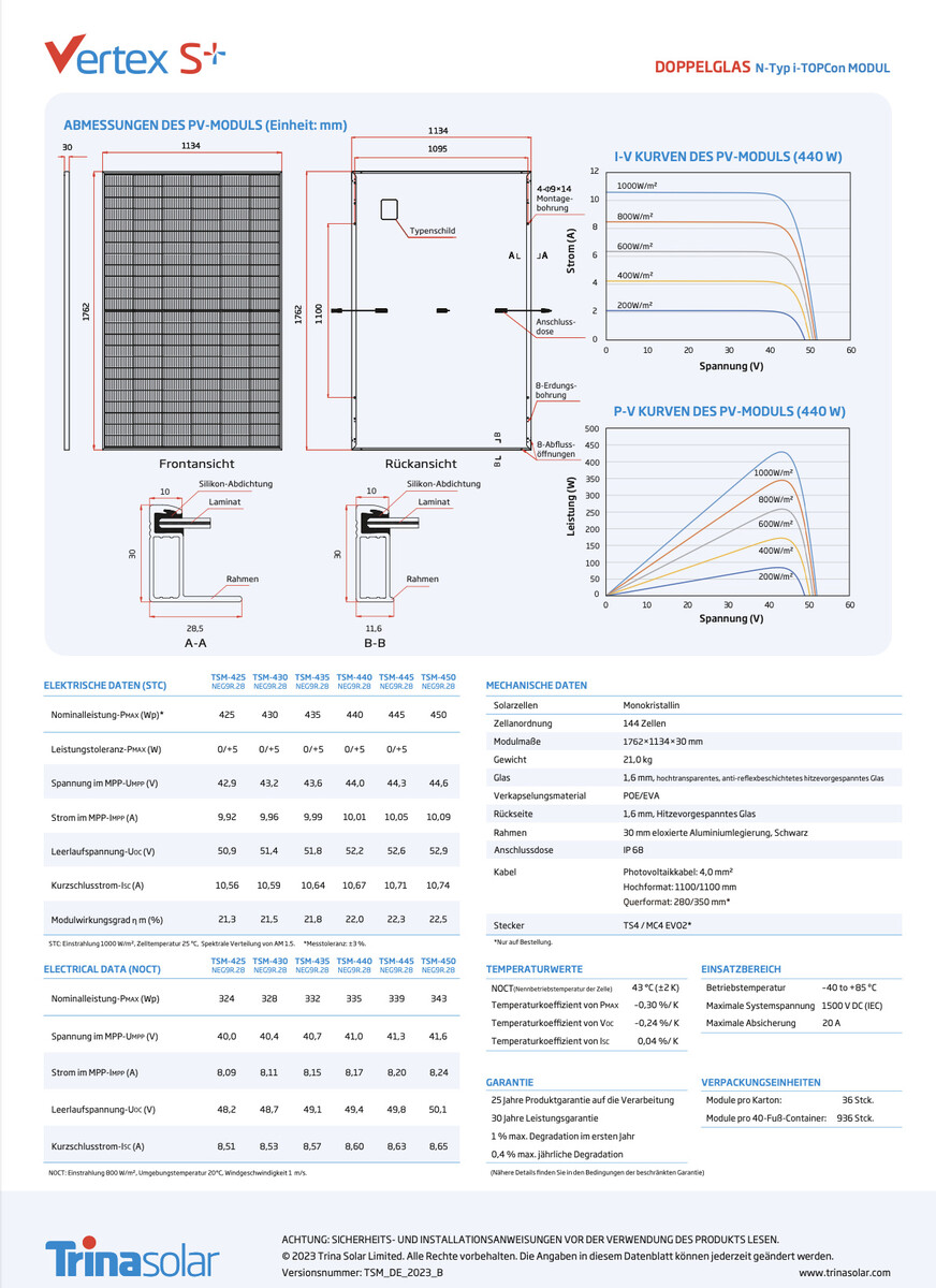 Derzeit gibt es ein attraktives Angebot für eine 12-kWp-Solaranlage mit Solarmodulen von Trina Solar bei einem Rabatt von 23 %. Der Lieferumfang umfasst 28 Doppelglas-Solarmodule Trina Vertex S+ TSM-NEG9R.28 mit je 430 Wp, was einer Gesamtleistung von 12,04 kWp entspricht. Die monokristallinen Glas-Glas-Module verfügen über einen edlen 30 mm hohen Rahmen aus schwarz eloxiertem Aluminium und haben einen Modulwirkungsgrad von bis zu 22,3 %.