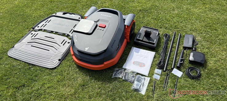Fangen wir mit dem Lieferumfang des Navimow X3 (X315) an. Geliefert wird der drahtlose Mähroboter mit einer einfachen Ladestation und ohne Garage bzw. Dach. Zudem liegen die 1,25 m hohe RTK-Antenne, das 10 m lange Stromkabel, 18 Ersatzklingen und das übliche Zubehör wie Erdschrauben zur Befestigung der Ladestation bei.