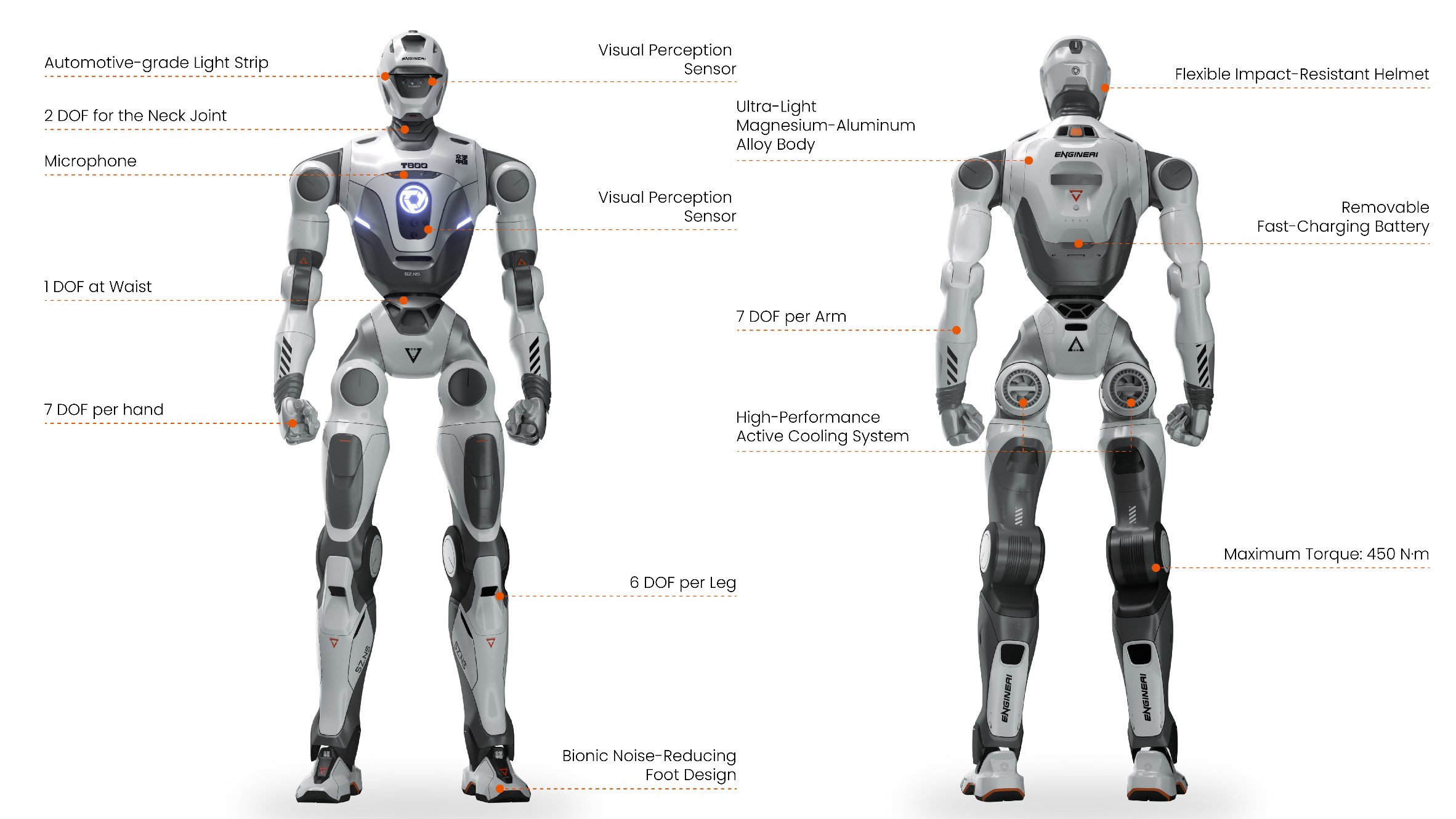Dank einer Spitzenleistung von 14 kW pro Gelenk kann jeder Beinmotor ein maximales Drehmoment von 450 N·m erzeugen, während jede Hand eine Traglast von 5 kg besitzt und mit taktilen Sensoren ausgestattet ist. Der T800 verwendet einen omnidirektionalen 360-Grad-LIDAR-Sensor, um Personen und Objekte zu umgehen, während er sich mit einer Geschwindigkeit von bis zu 3 m/s bewegt. Eine Intel-N97-CPU in Verbindung mit einem Nvidia-AGX-Orin-64-GB-KI-Modul versorgt den Humanoiden mit der nötigen Rechenleistung, während er Kampfsporttritte ausführt oder in industriellen Umgebungen wie Lagerhäusern arbeitet.