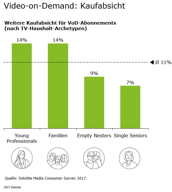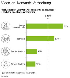 Video-on-Demand (VoD) holt aber mit Riesenschritten auf und kann bereits heute vor allem bei jungen Menschen und Familien punkten. Hier liegt die Nutzung von VoD-Angeboten inzwischen bei 50 bis fast 70 Prozent. Von der älteren Verbrauchergruppe kann sich nur ein knappes Fünftel für VoD erwärmen. In der Deloitte-Studie werden die untersuchten Konsumentengruppen in vier Haushalts-Archetypen eingeteil: junge Berufstätige, Familien, ältere Paare, deren Kinder bereits aus dem Haus sind, sowie alleinstehende Senioren.