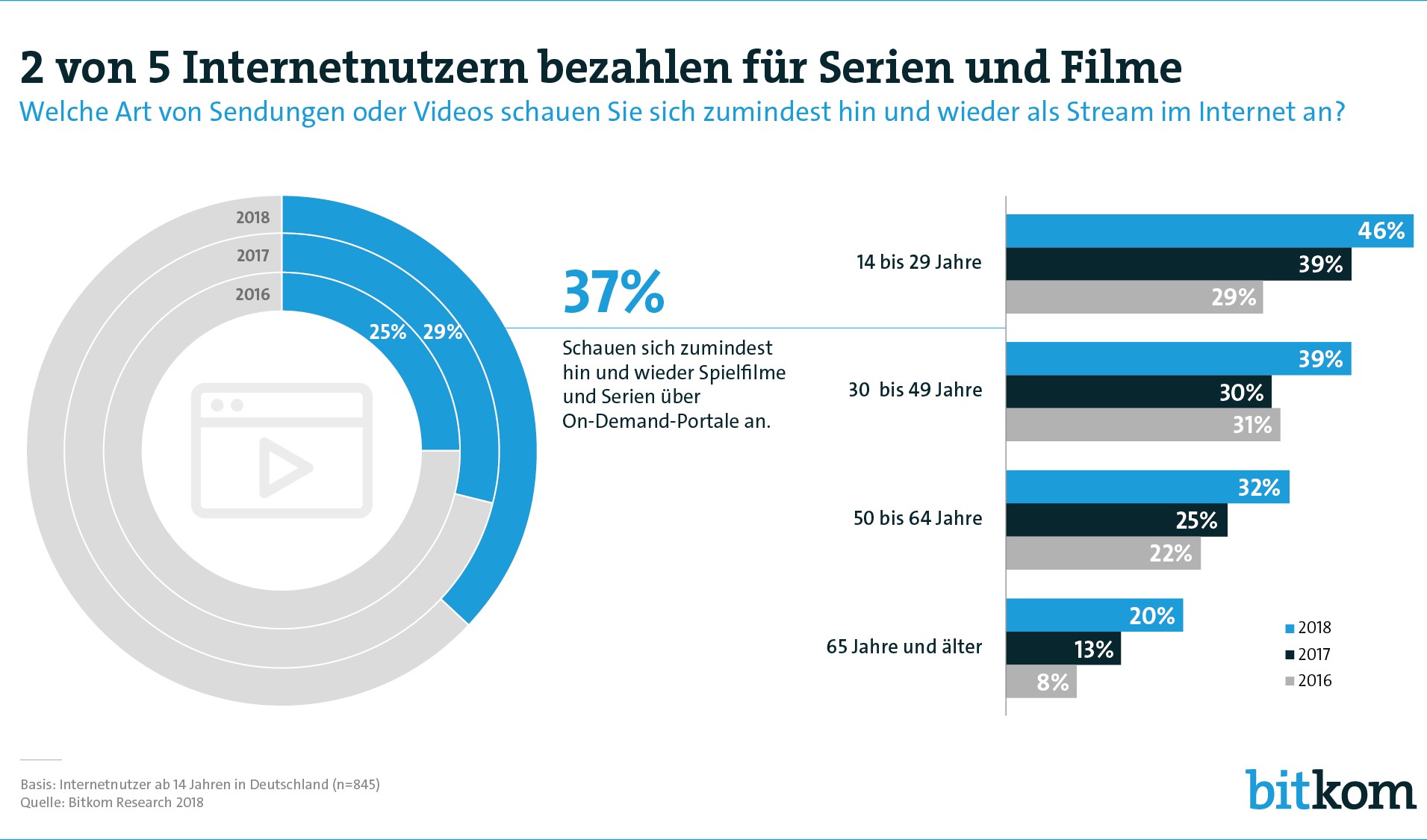 Während in den vergangenen Jahren vor allem jüngere Internetnutzer die Flatrates auf Serien und Filme zu schätzen wussten, nutzen mittlerweile auch immer häufiger die älteren Semester die Streaming-Angebote. In der Generation 65 plus ruft laut dem Bitkom immerhin jeder fünfte Internetnutzer (20 Prozent) Spielfilme und Serien über kostenpflichtige Video-Streaming-Dienste ab. 2016 waren es erst 8 Prozent, 2017 13 Prozent.