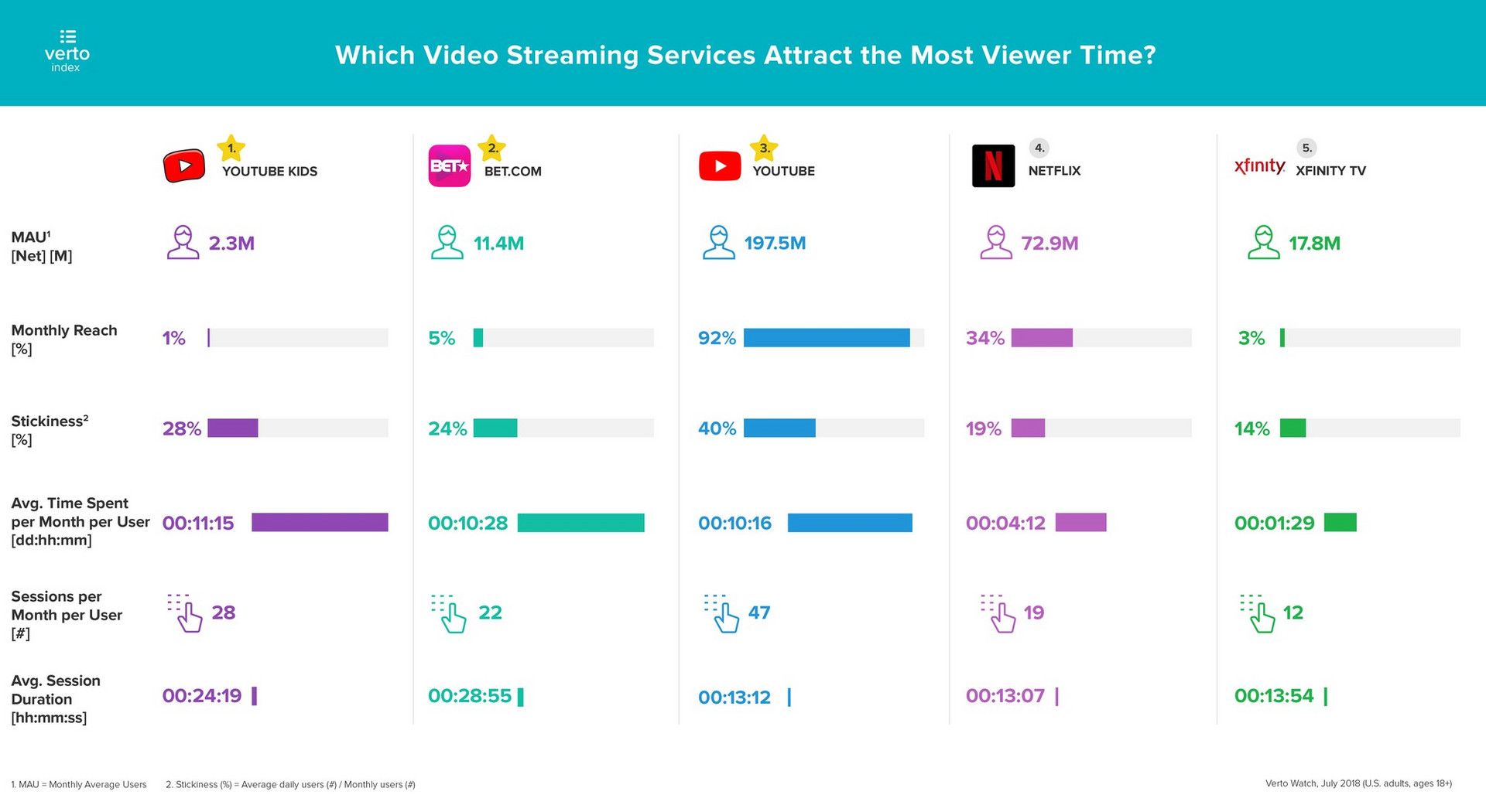 Verto hat auch analysiert, welche Videostreaming-Services in den Vereinigten Staaten den höchsten Anteil an wiederkehrenden Besuchern anlocken und welche Video-Portale das größte Volumen an Nutzerzeit pro Monat generieren. Im Ranking der Top 10 US-Streaming-Video-Anbieter bleibt YouTube mit einem Reach von 92,1 % bei der erwachsenen US-Bevölkerung sowie einer durchschnittlichen Nutzungsdauer von mehr als 10 Stunden pro Monat und Nutzer die Nummer 1.